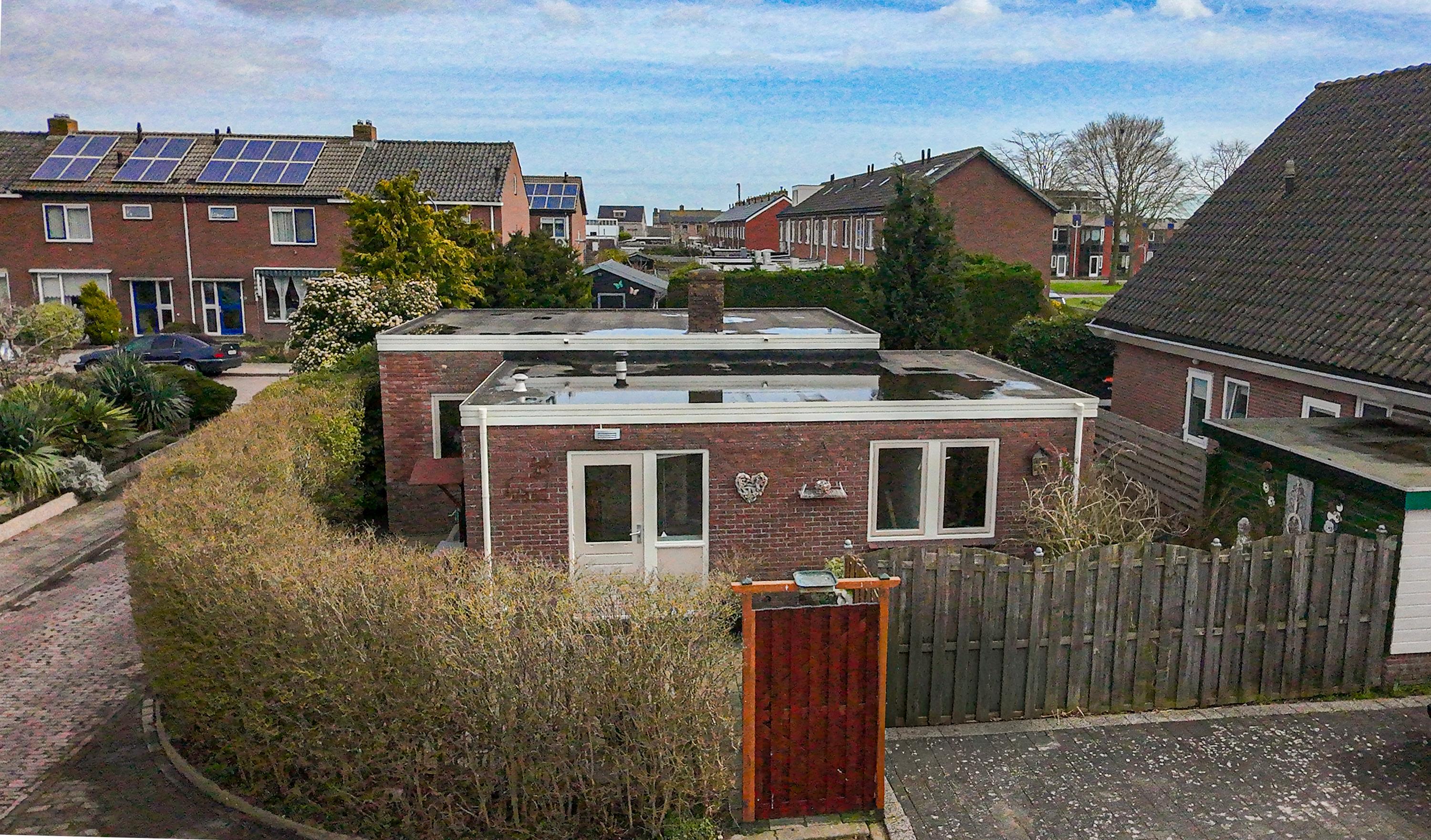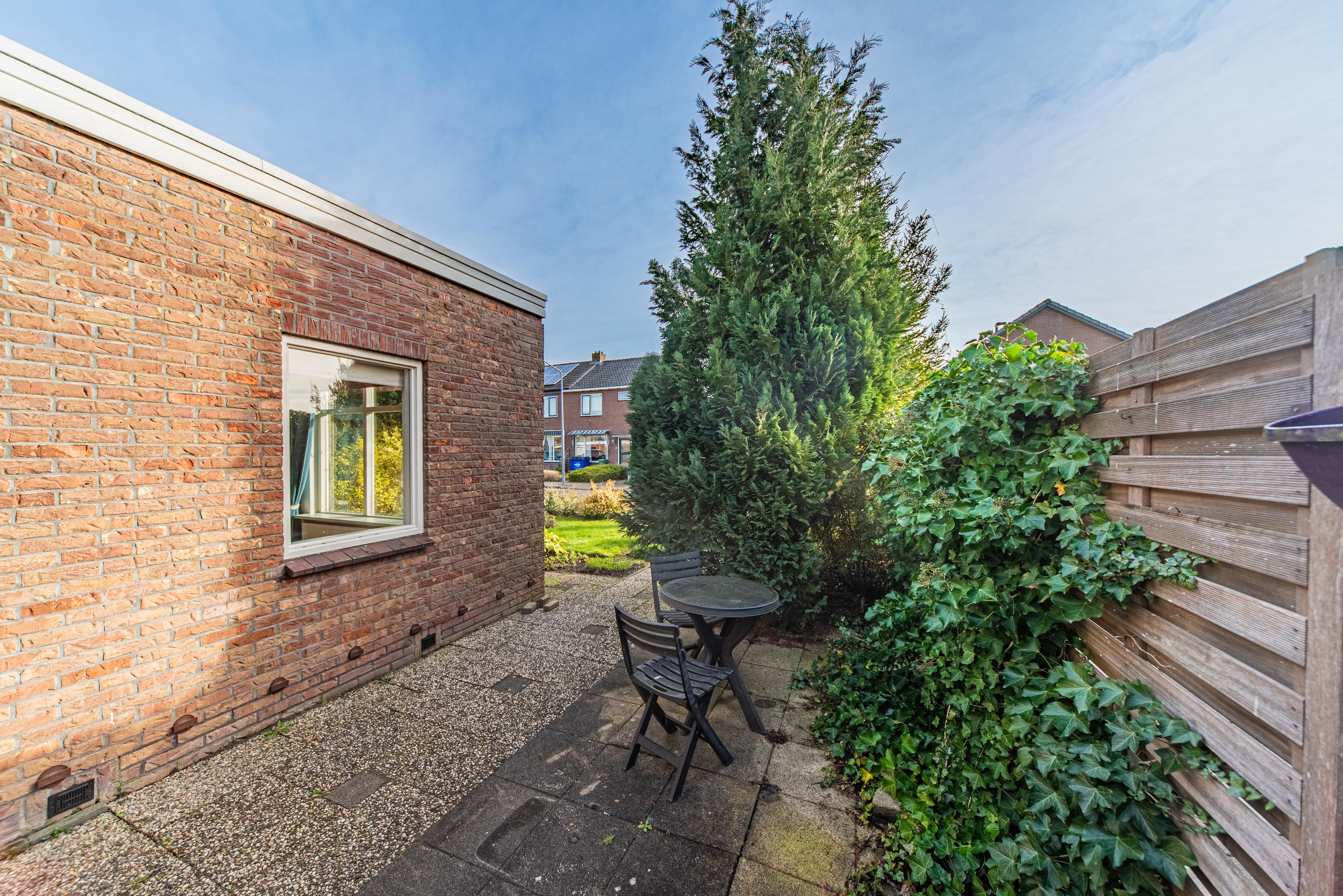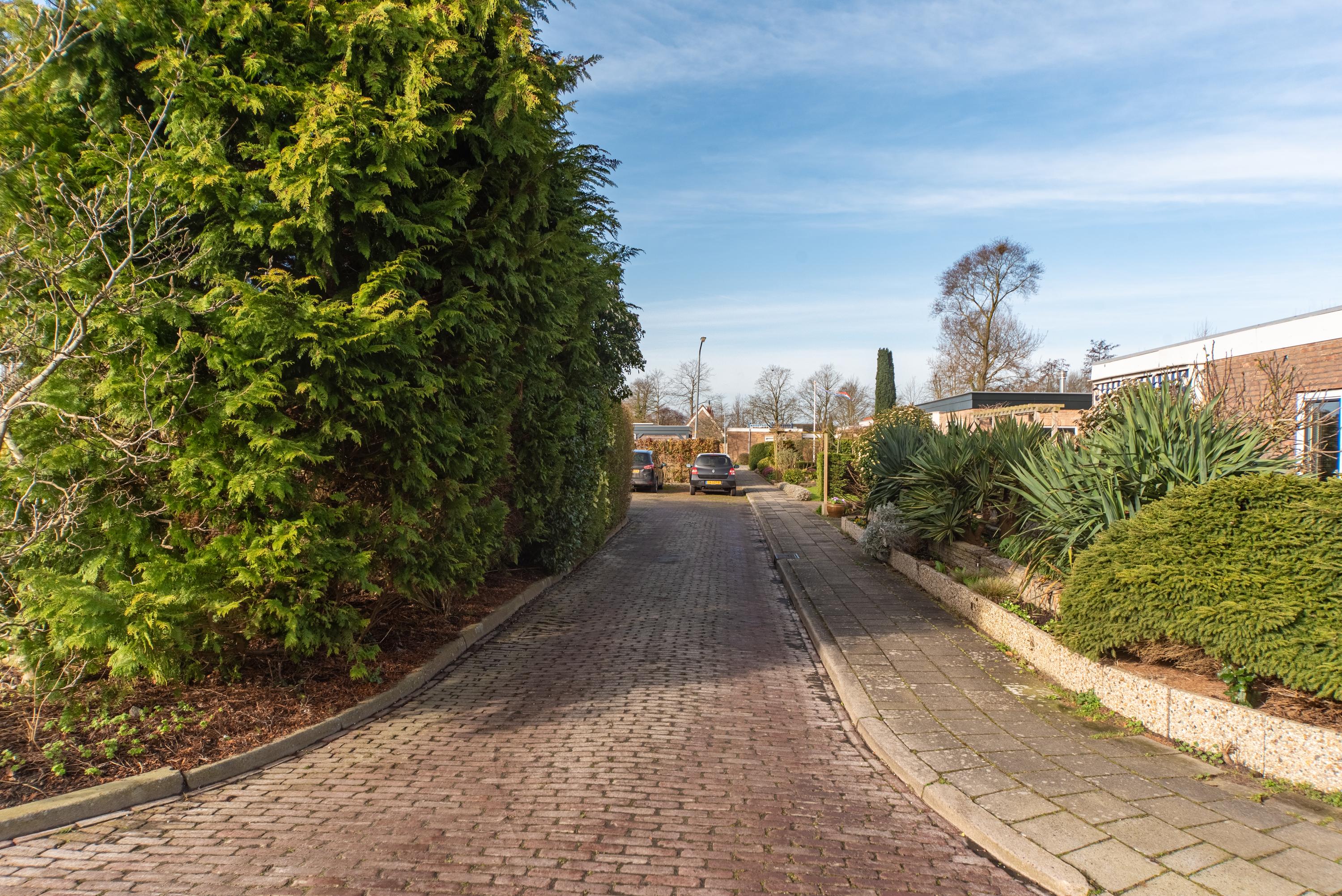 De tuin rondom is onderhoudsvriendelijk en overzichtelijk door de nette bestrating en bied veel privacy door de hoge coniferen en strakke haag aan de achterzijde. Dankzij het platte dak en de bungalowstijl is alles makkelijk bereikbaar en voelt het geheel ruimtelijk aan.