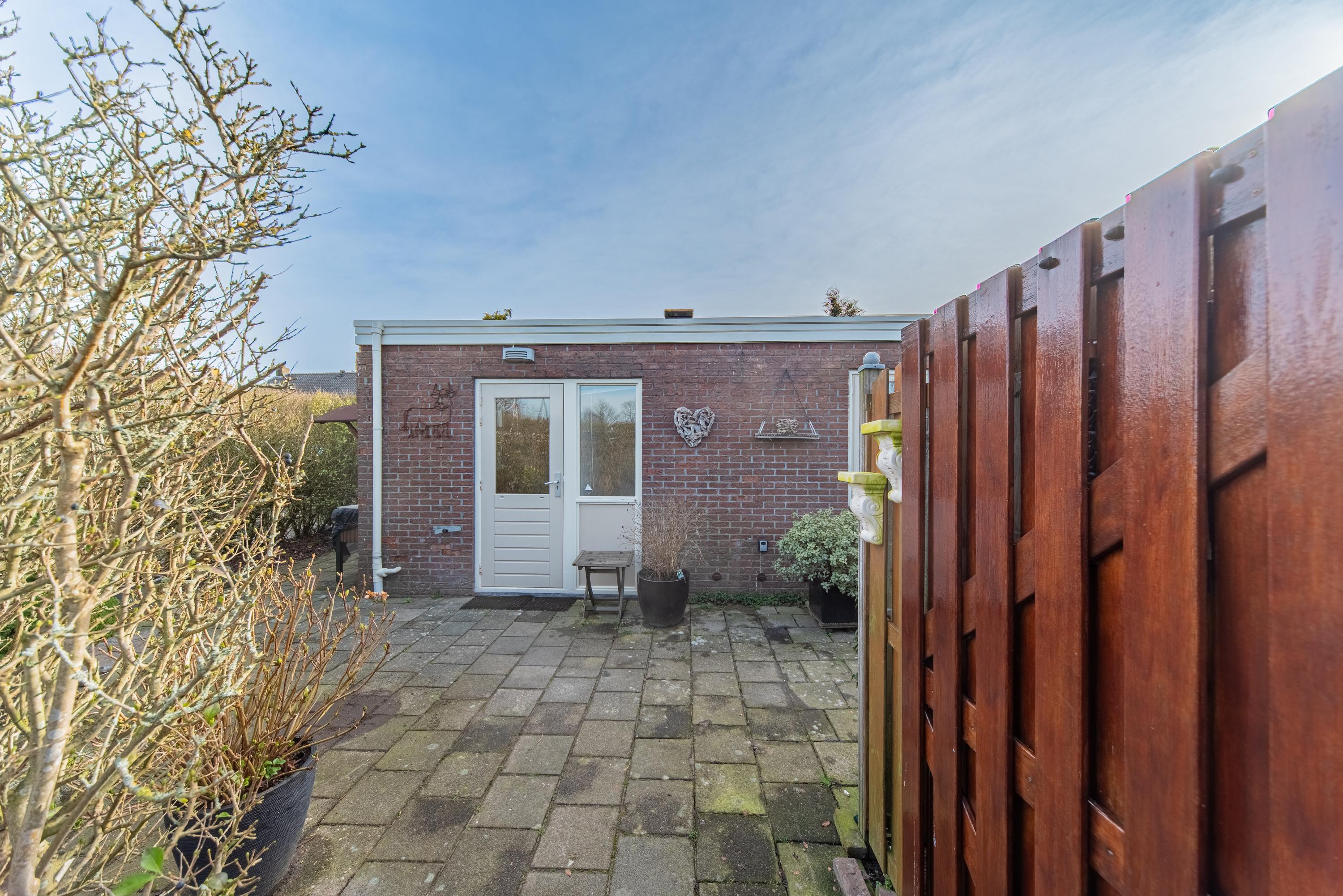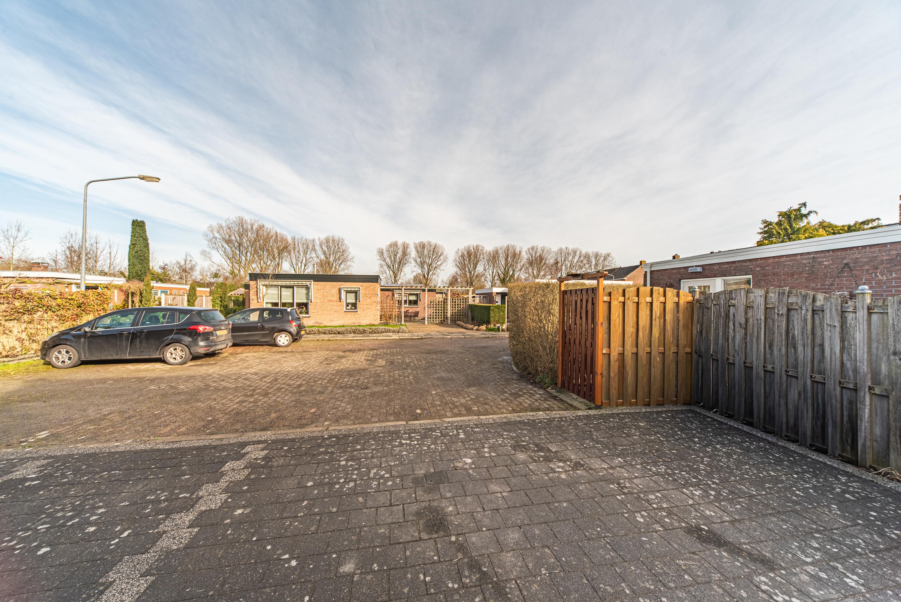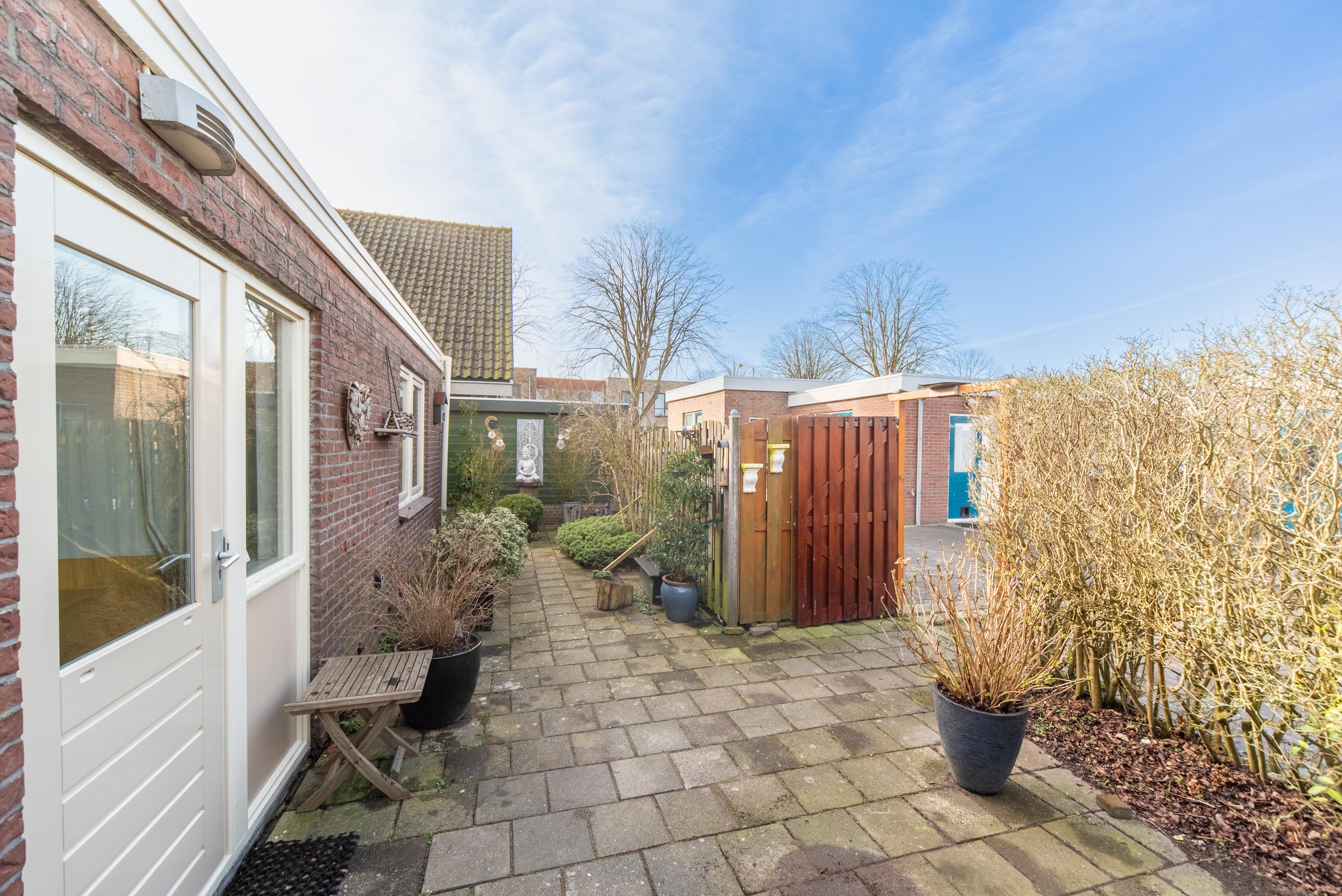 De tuin rondom is onderhoudsvriendelijk en overzichtelijk door de nette bestrating en bied veel privacy door de hoge coniferen en strakke haag aan de achterzijde. Dankzij het platte dak en de bungalowstijl is alles makkelijk bereikbaar en voelt het geheel ruimtelijk aan.
