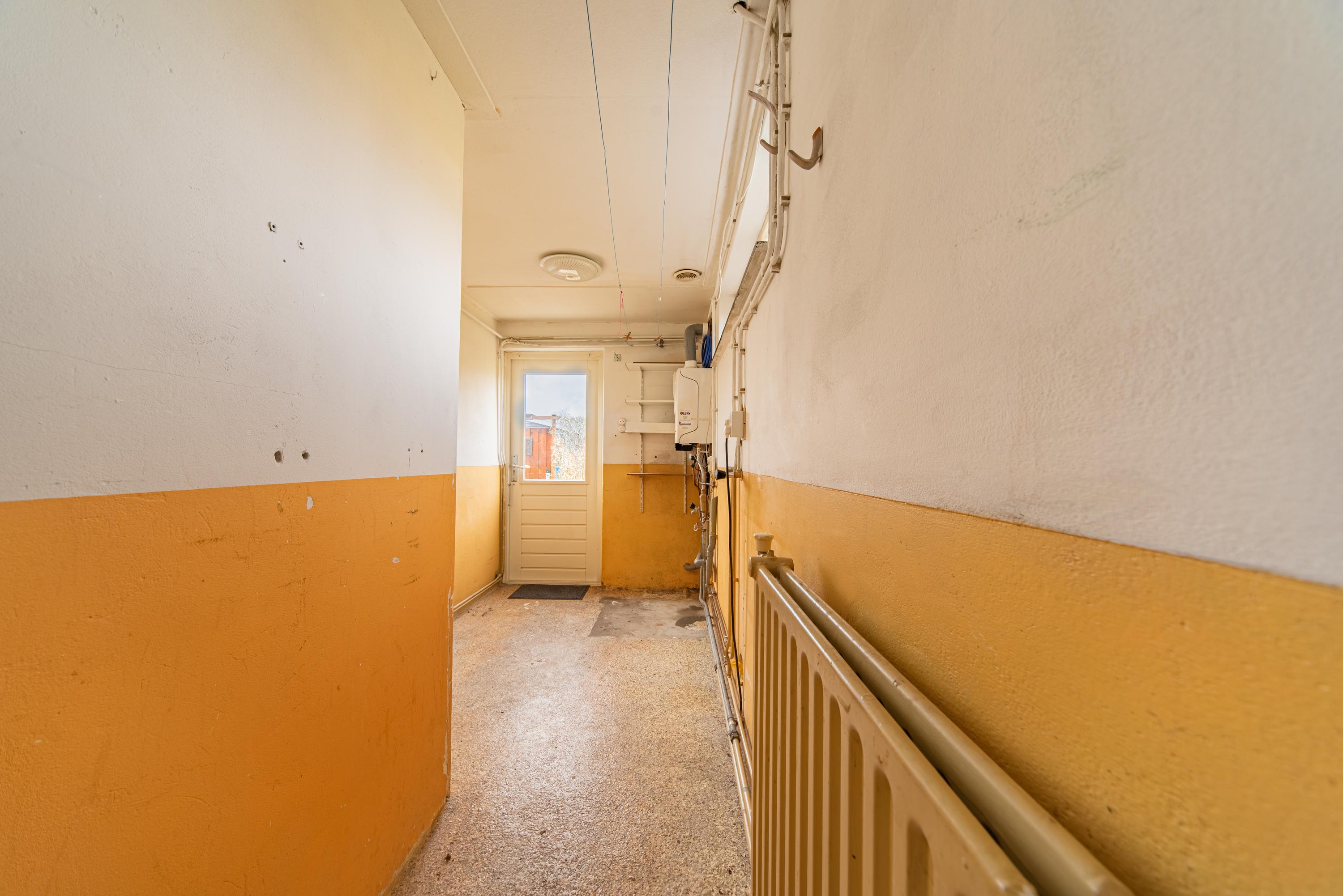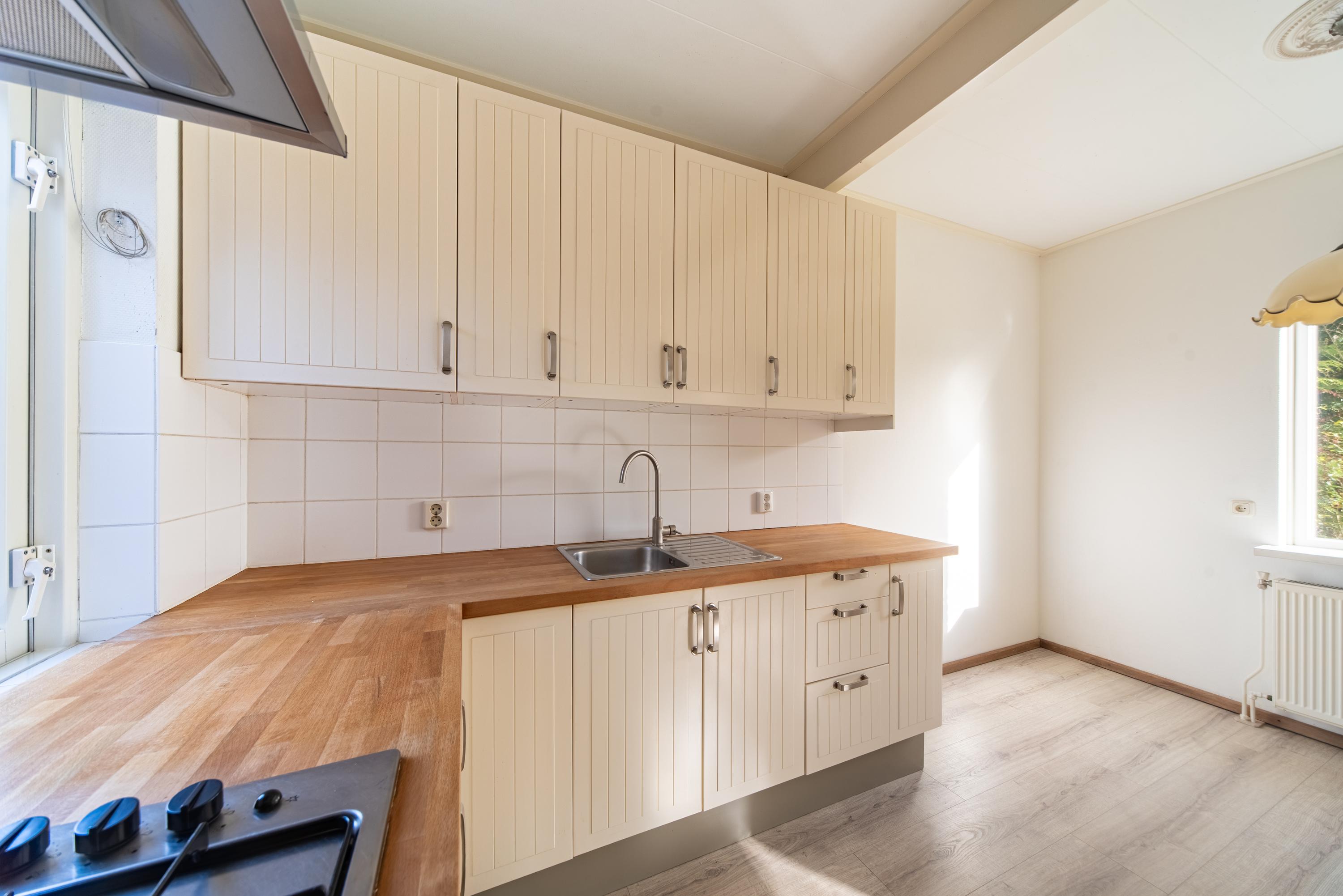 De open keuken sluit niet alleen aan op de woonkamer maar bied ook toegang tot de bijkeuken, waar u ook de achterom vindt. Deze komt uit op de openbare parkeerplaatsen achter de woning ideaal voor als u de dagelijkse boodschappen heeft gedaan of veilig en ruim uw auto wilt kunnen parkeren.