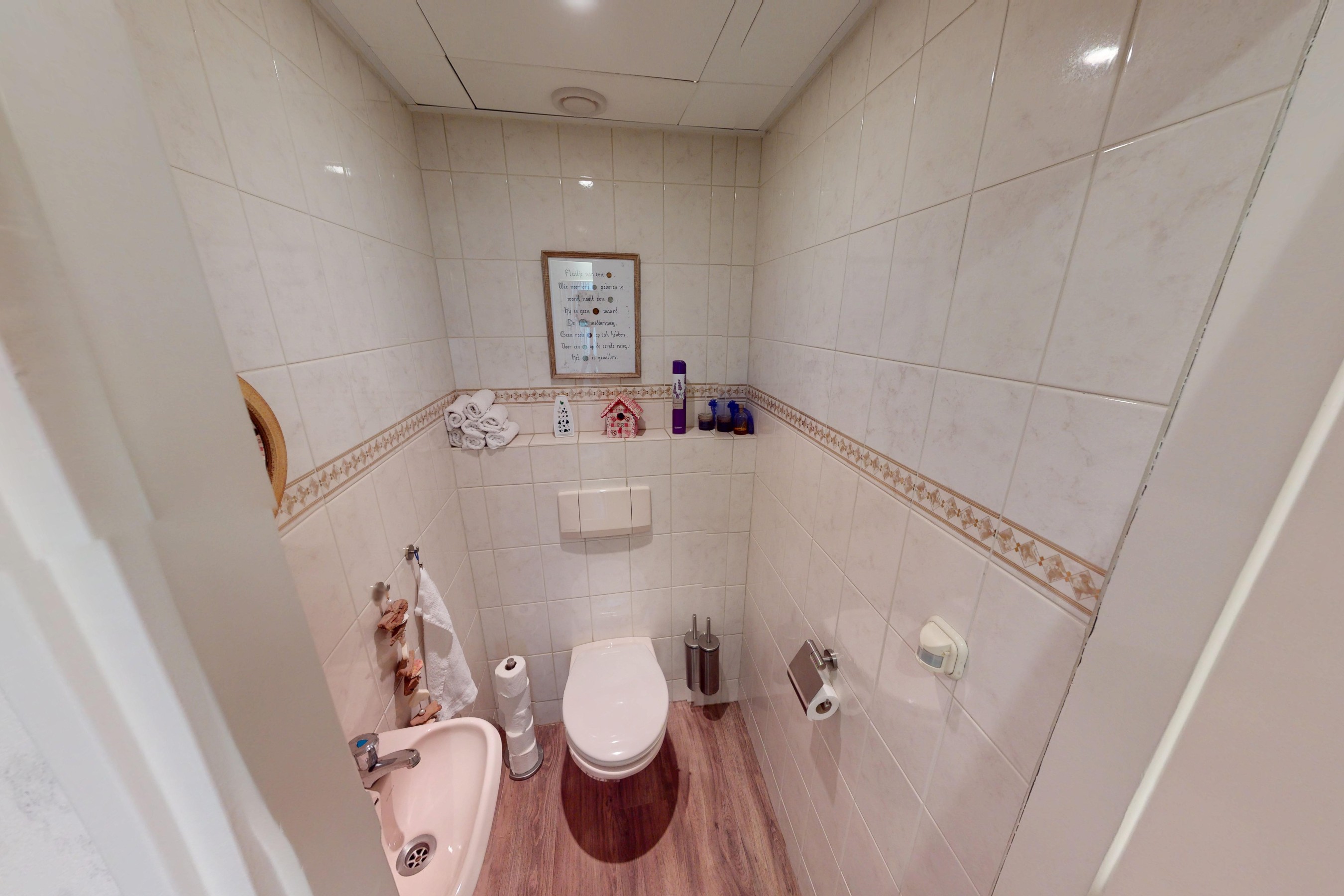 Begane grond: in de ruime hal treft u naast de garderoberuimte ook de meterkast aan. Bovendien kunt u hier ook de 1e verdieping bereiken. Daarnaast treft u een volledig betegelde ruime toiletruimte aan met hangcloset en fonteintje.