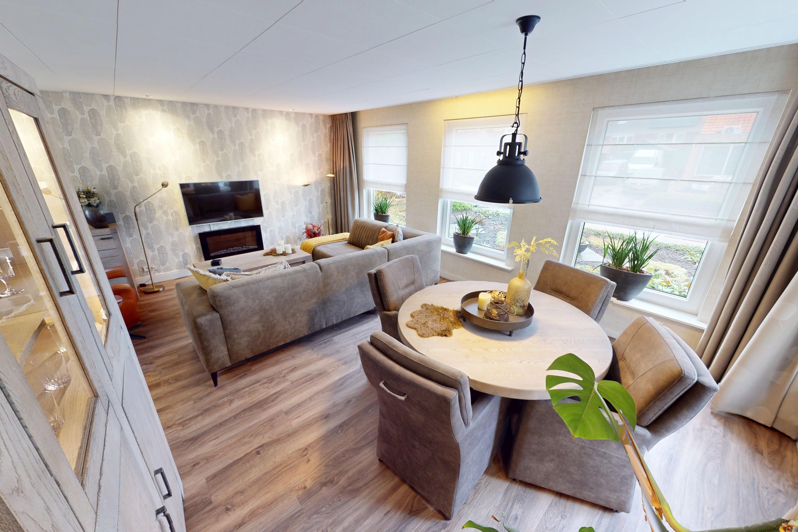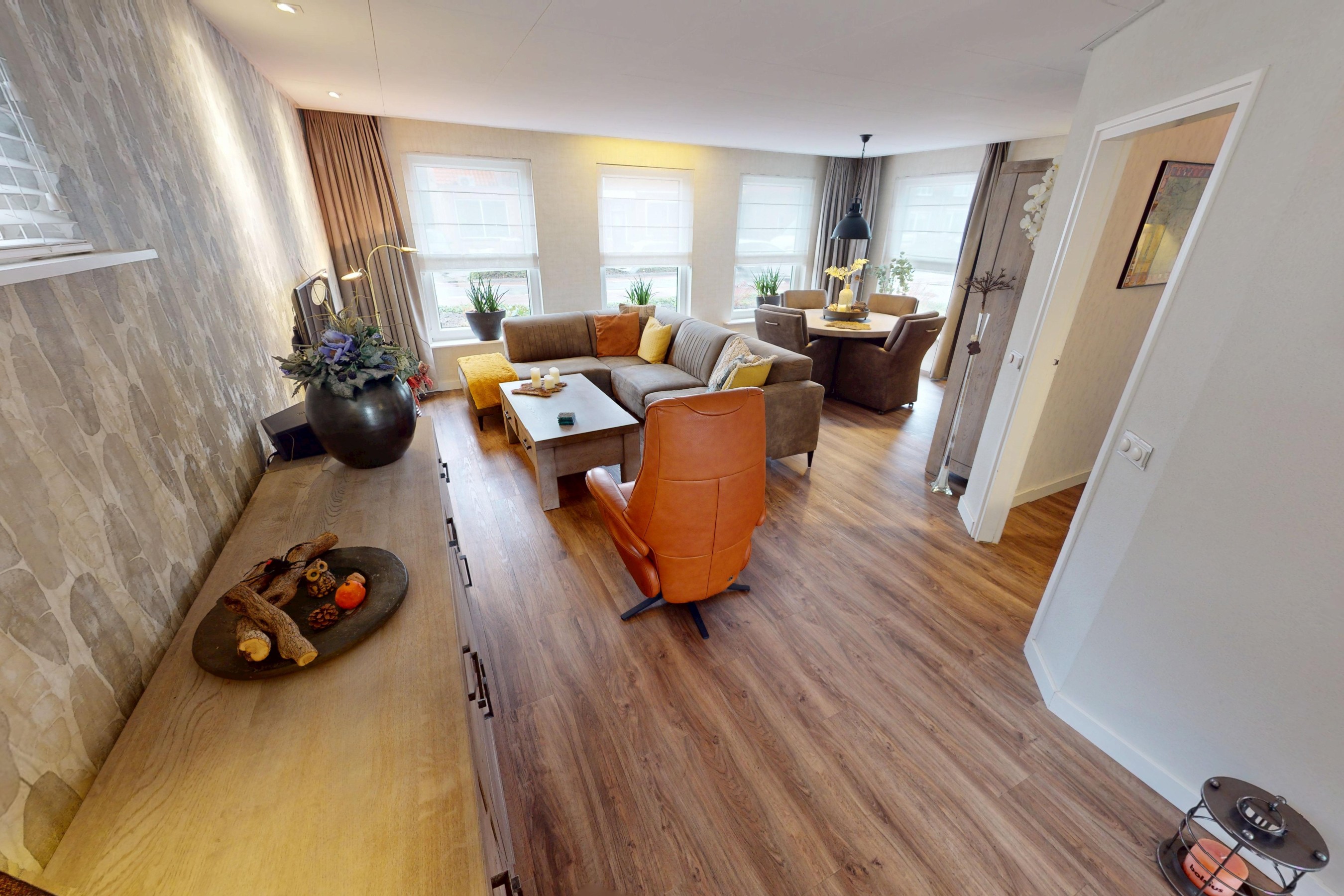 Vanuit de ruime zitkamer met grote raampartijen heeft u zicht op de straat. De woonkamer is uitgevoerd met PVC vloerdelen met CV-vloerverwarming, de wanden en het plafond zijn keurig afgewerkt. Het geheel geeft u een zeer ruimtelijk gevoel. Door de riante afmetingen kunt op diverse wijzen uw interieur inrichten. Via een toog kunt u de half open keuken bereiken.