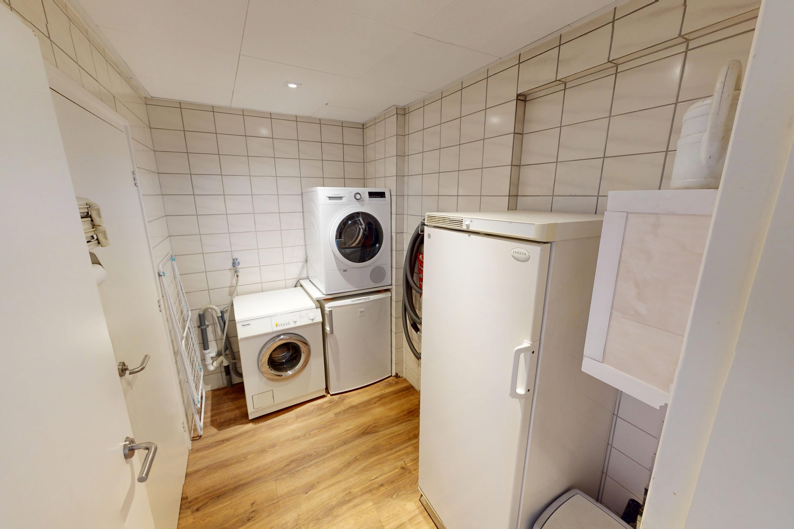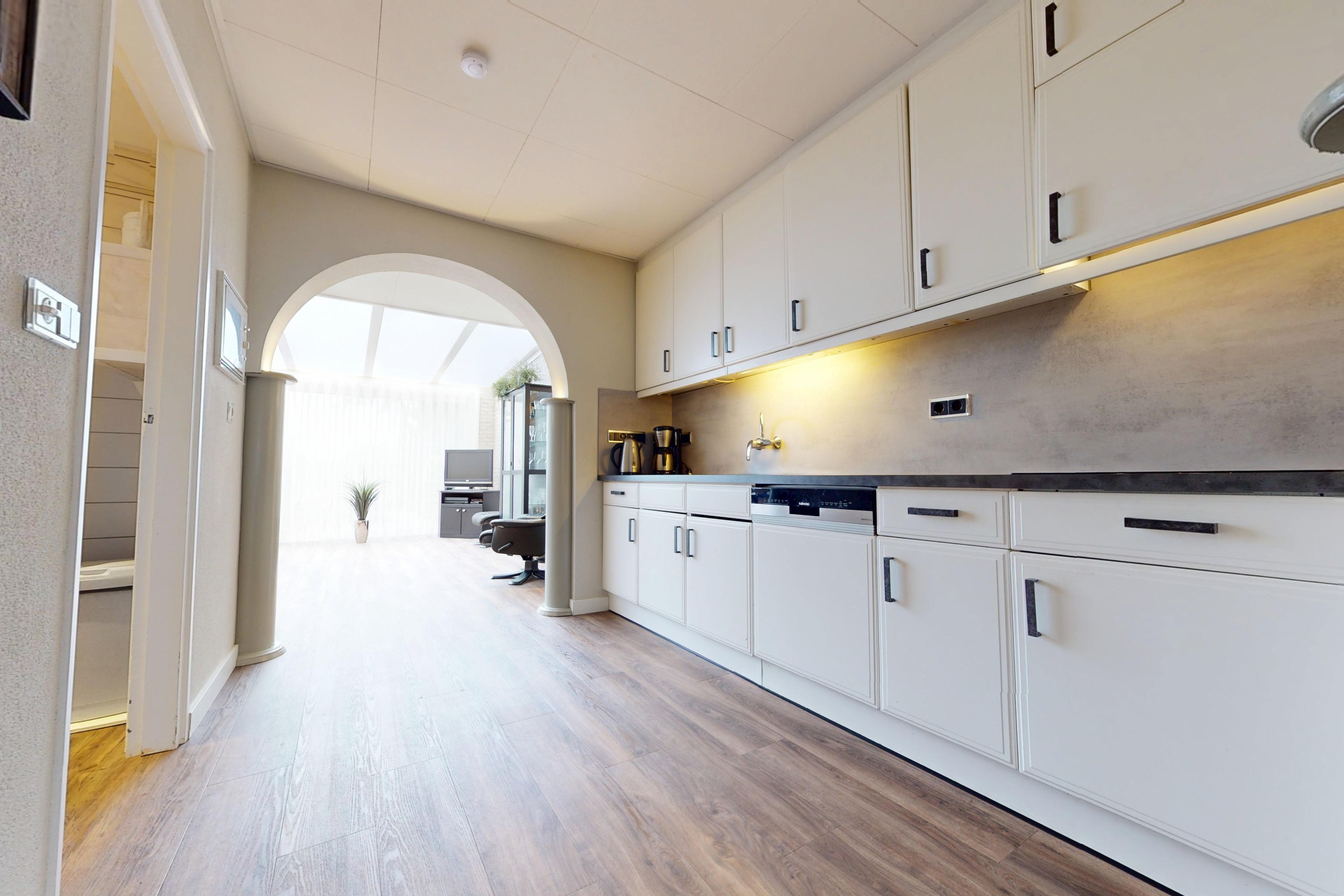 Bijkeuken: naast de keuken bevindt zich een ruime bijkeuken. Deze bijkeuken is volledig betegeld en u kunt hier prima een grote koel/vriescombinatie plaatsen. Bovendien is hier ruimte voor het plaatsen van een wasmachine.