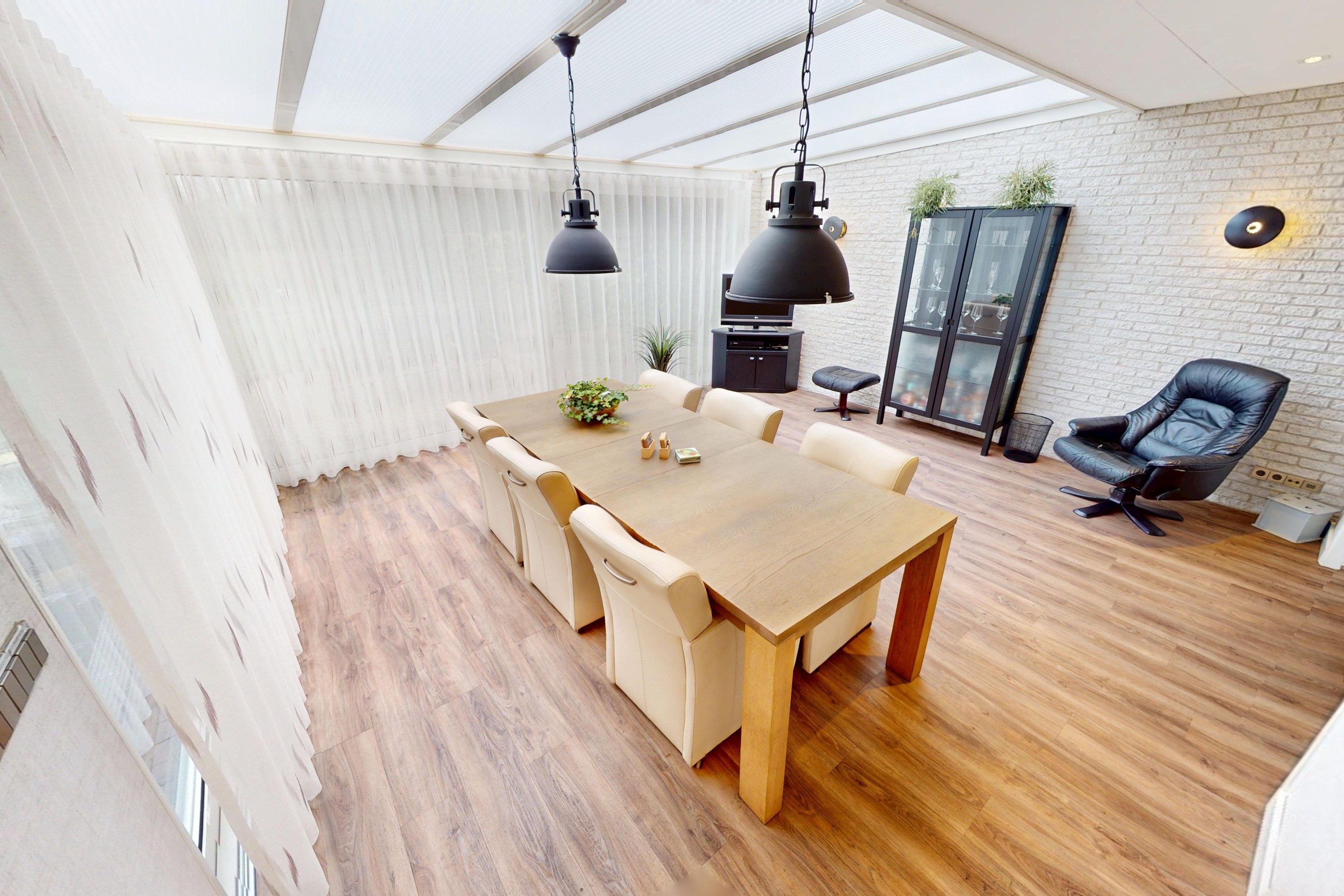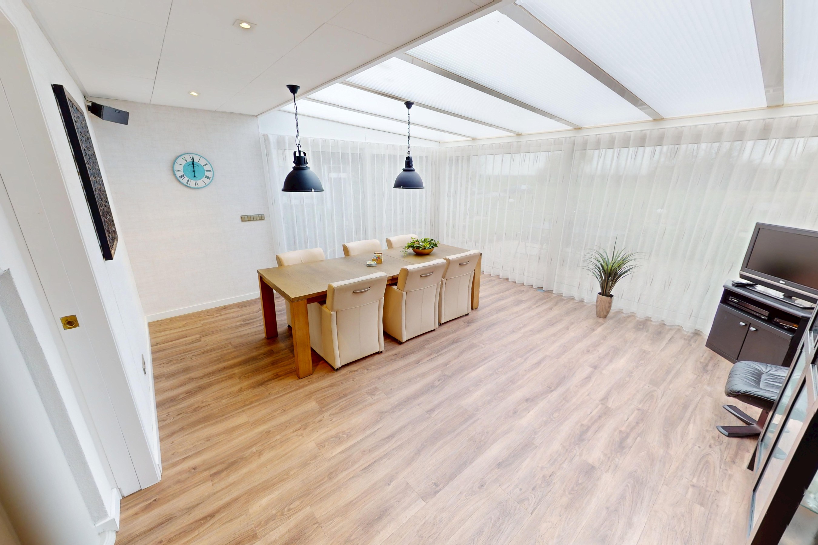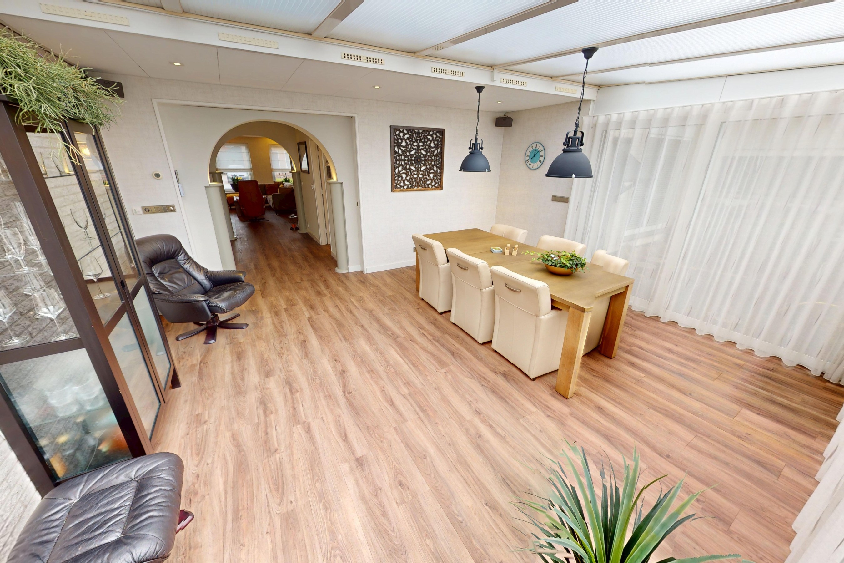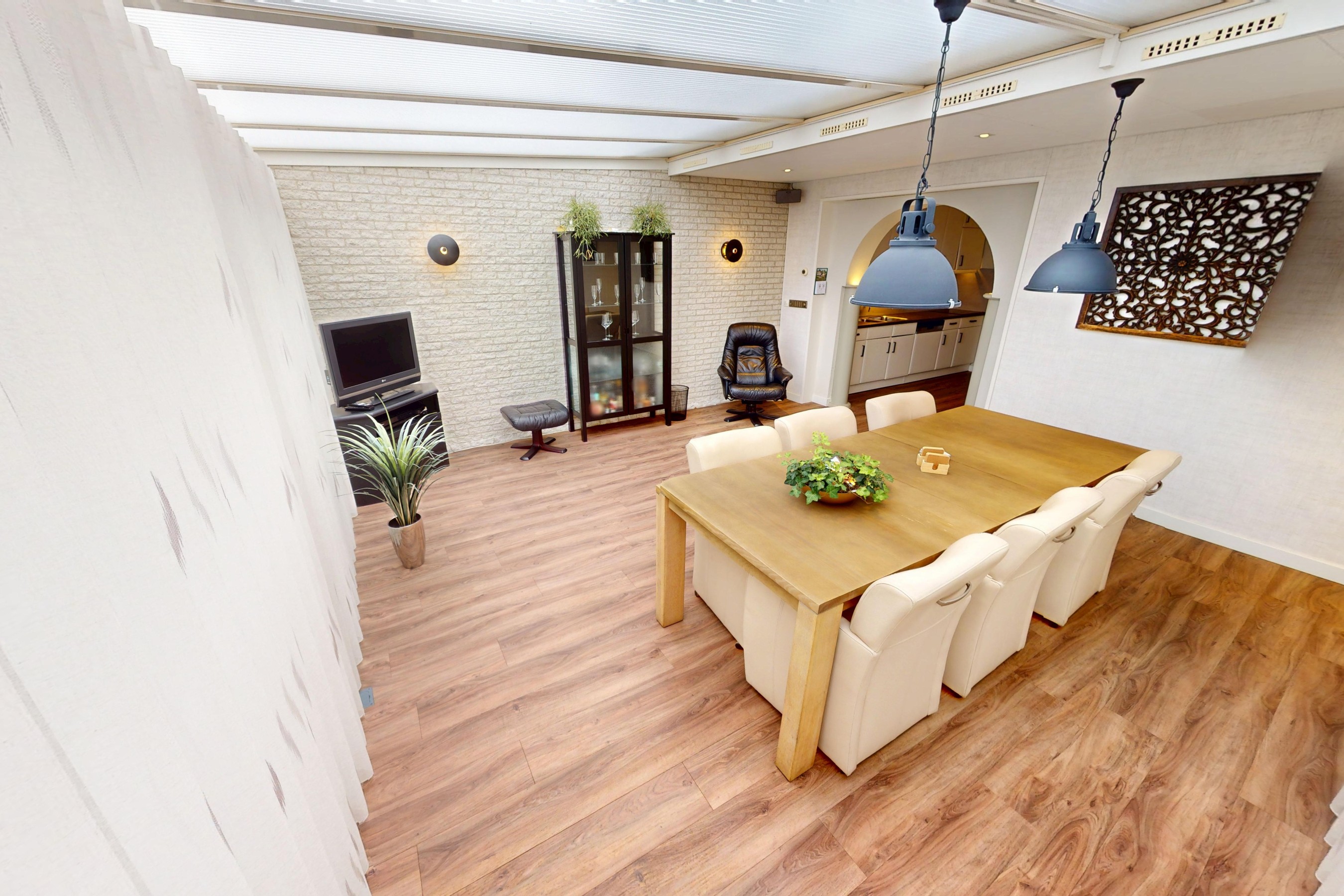 De fraaie serre met CV vloerverwarming is gelegen op het zuidenwesten en geeft u het hele jaar door de mogelijkheid om binnen en buiten met elkaar te combineren. De serre is uitgevoerd met een schuifpui en grote raampartijen. De afwerking met PVC vloerdelen is in deze ruimte eveneens doorgevoerd. U kunt hier prima een grote eettafel plaatsen. Een heerlijke plek om met het gezin of vrienden na te tafelen of spelletjes te doen. De serre kunt u met een bijzondere schuifdeur afsluiten van de overige leefruimte. Zo creëert u een geheel afgesloten ruimte.