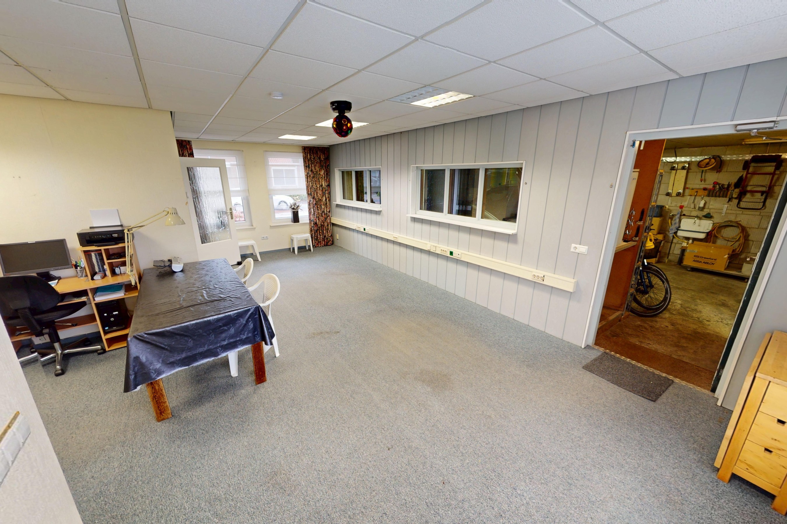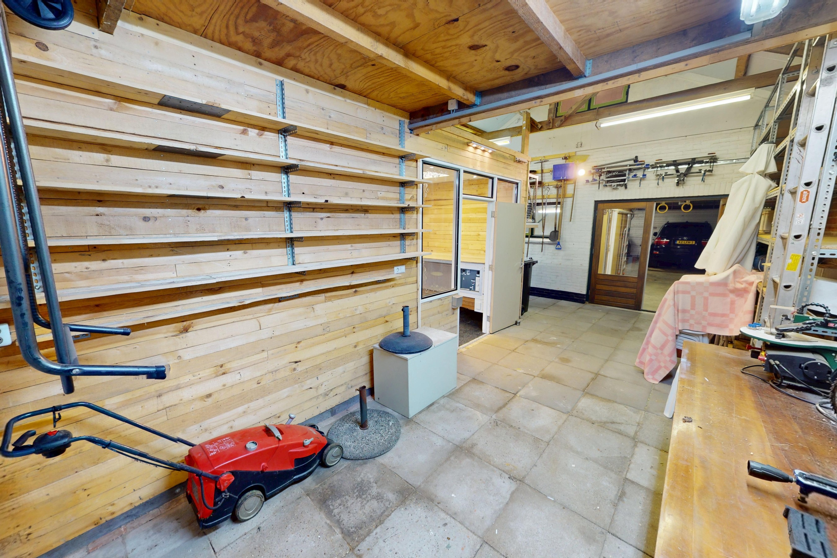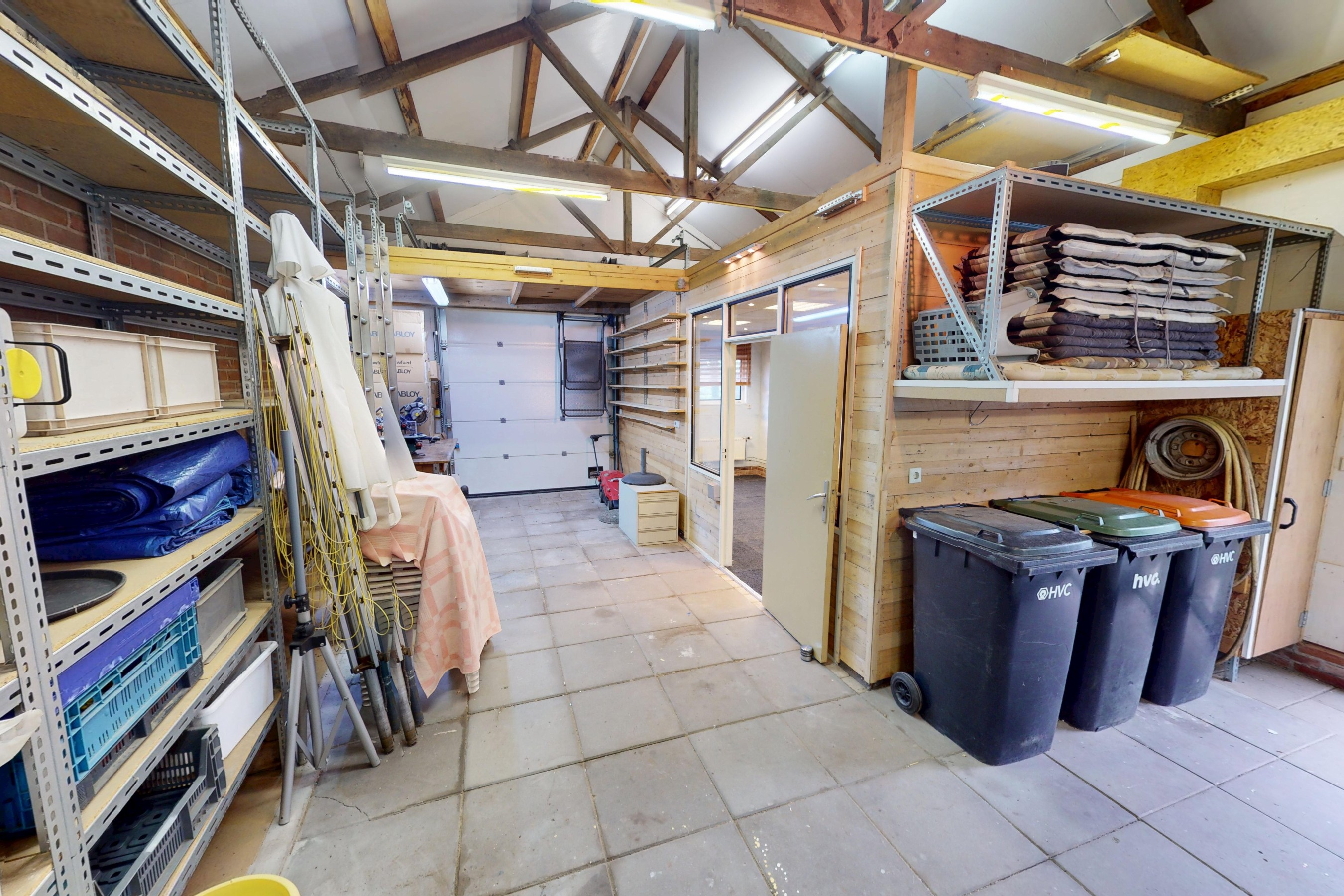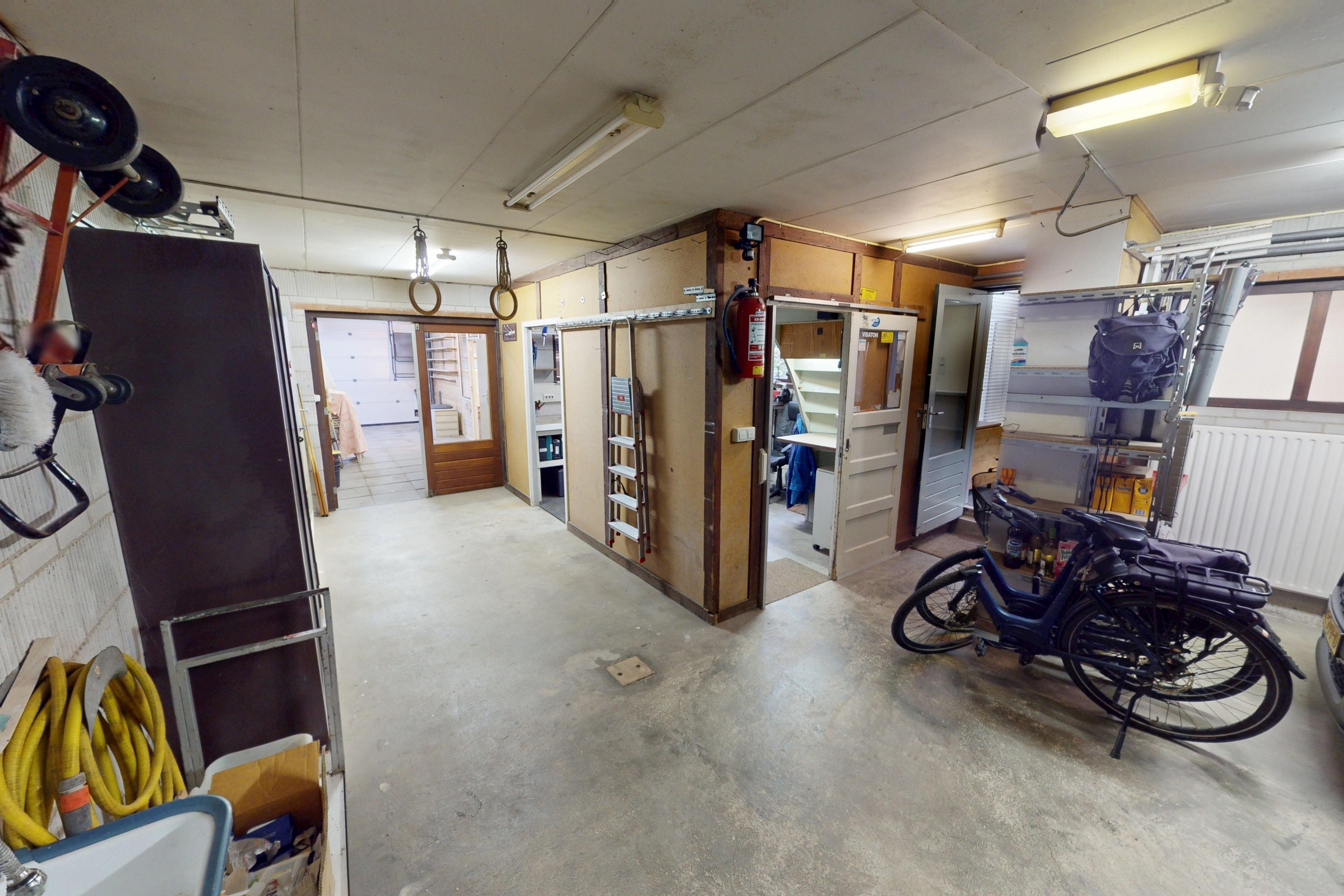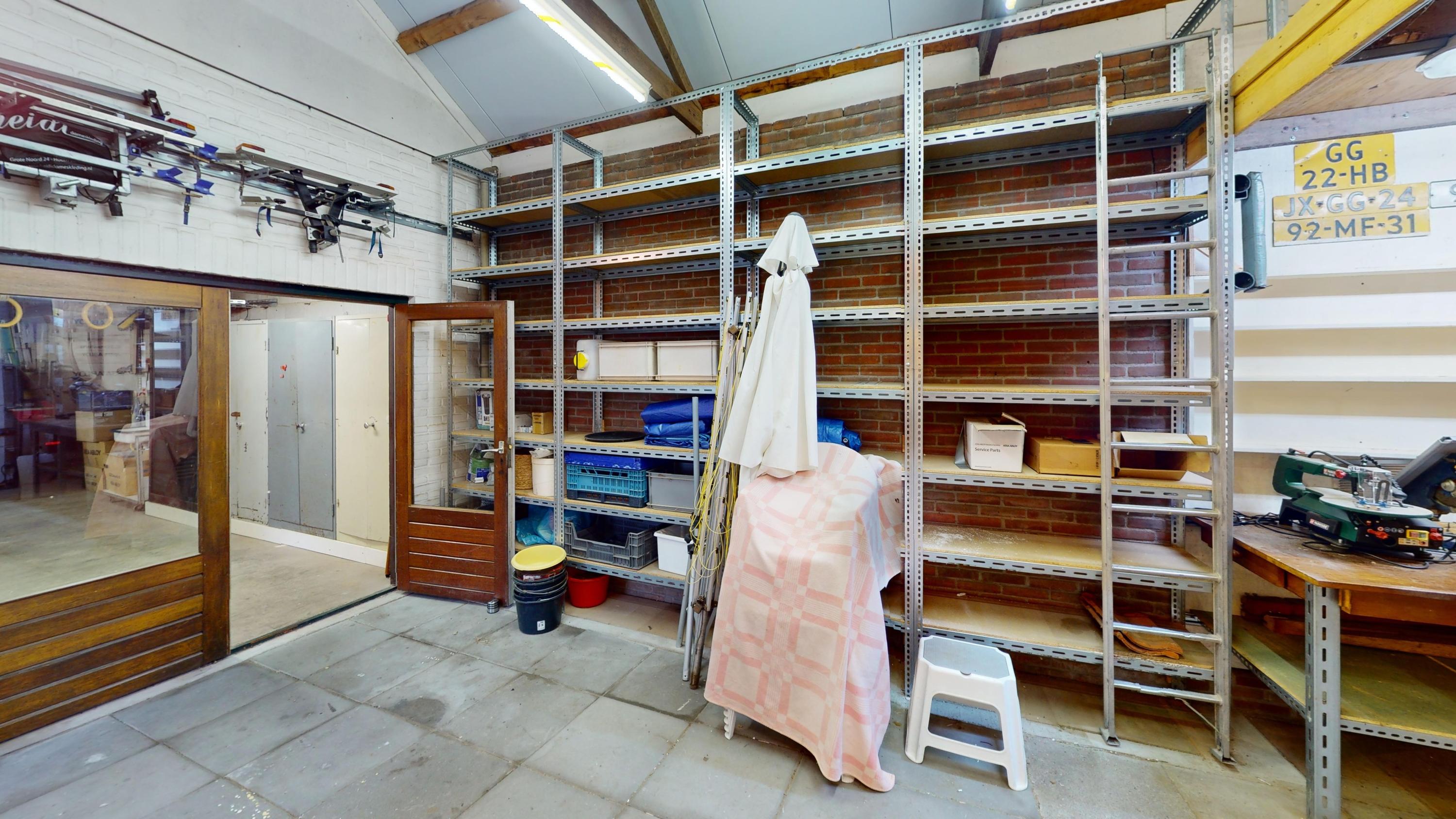 De garage is verder nog opgedeeld in een aparte werkplaats met een vaste trap naar de verdieping en aan het einde van de garage is een grote schuur aangebouwd. Via openslaande tussendeuren kunt u de aangebouwde schuur bereiken. Deze schuur is voorzien van betontegels, sectionaaldeur aan de achterzijde met toegang naar de tuin, een extra kantoorgedeelte dat eveneens verwarmd is.