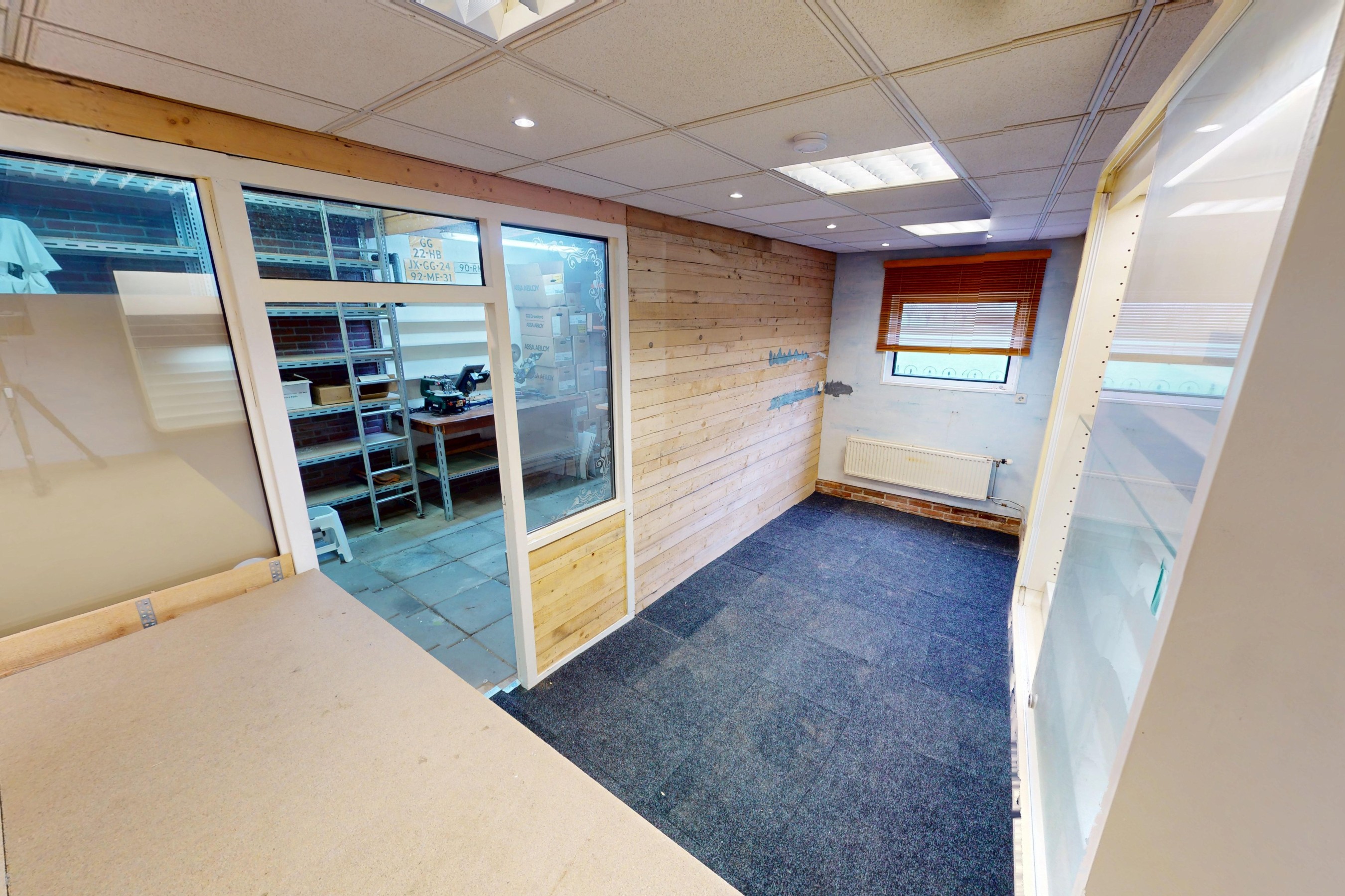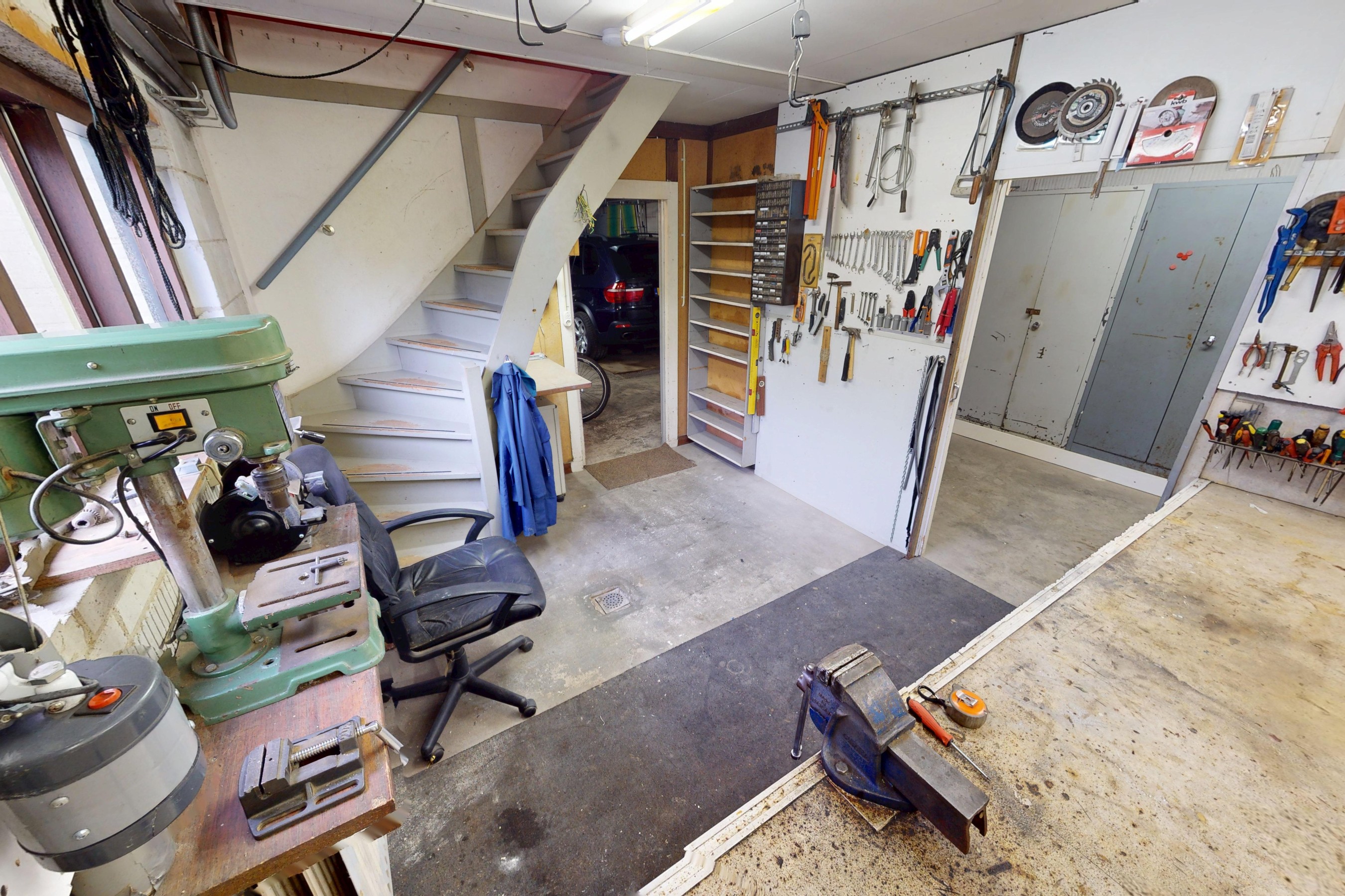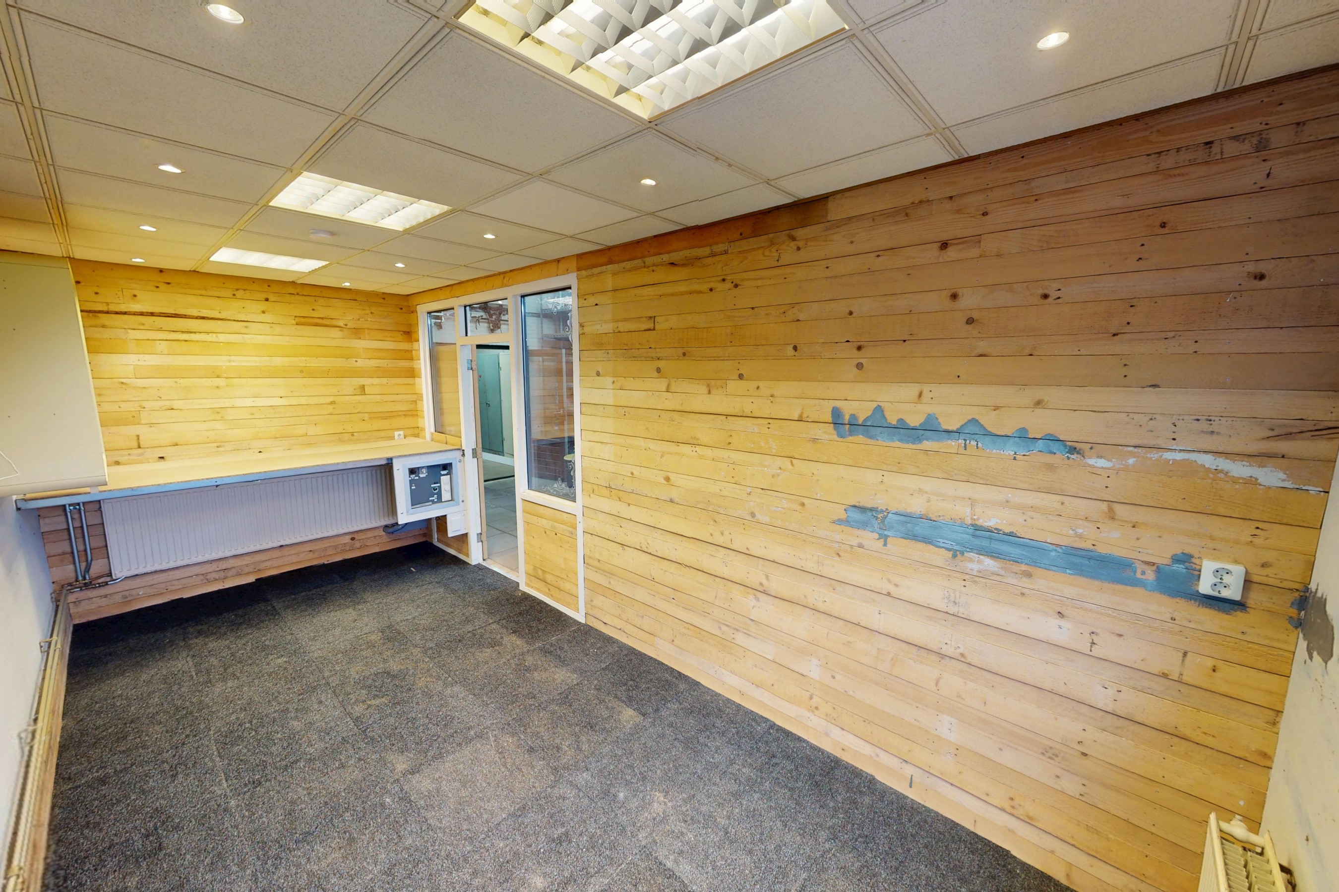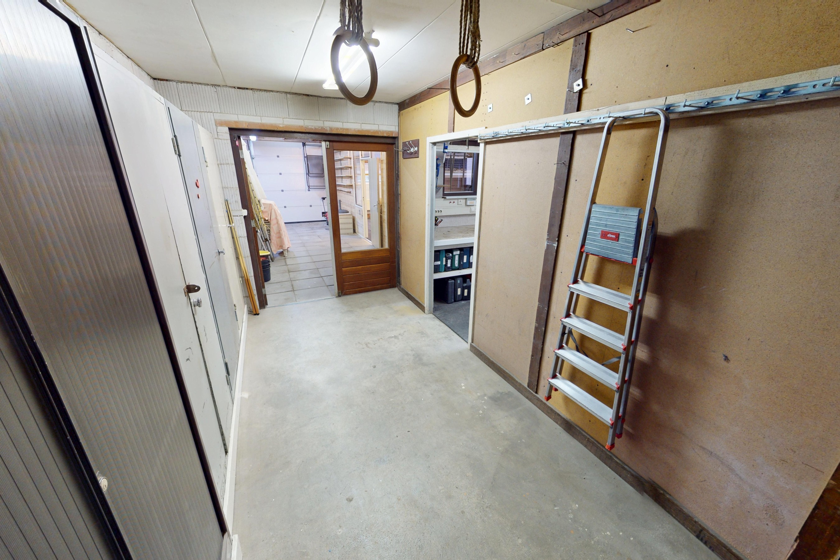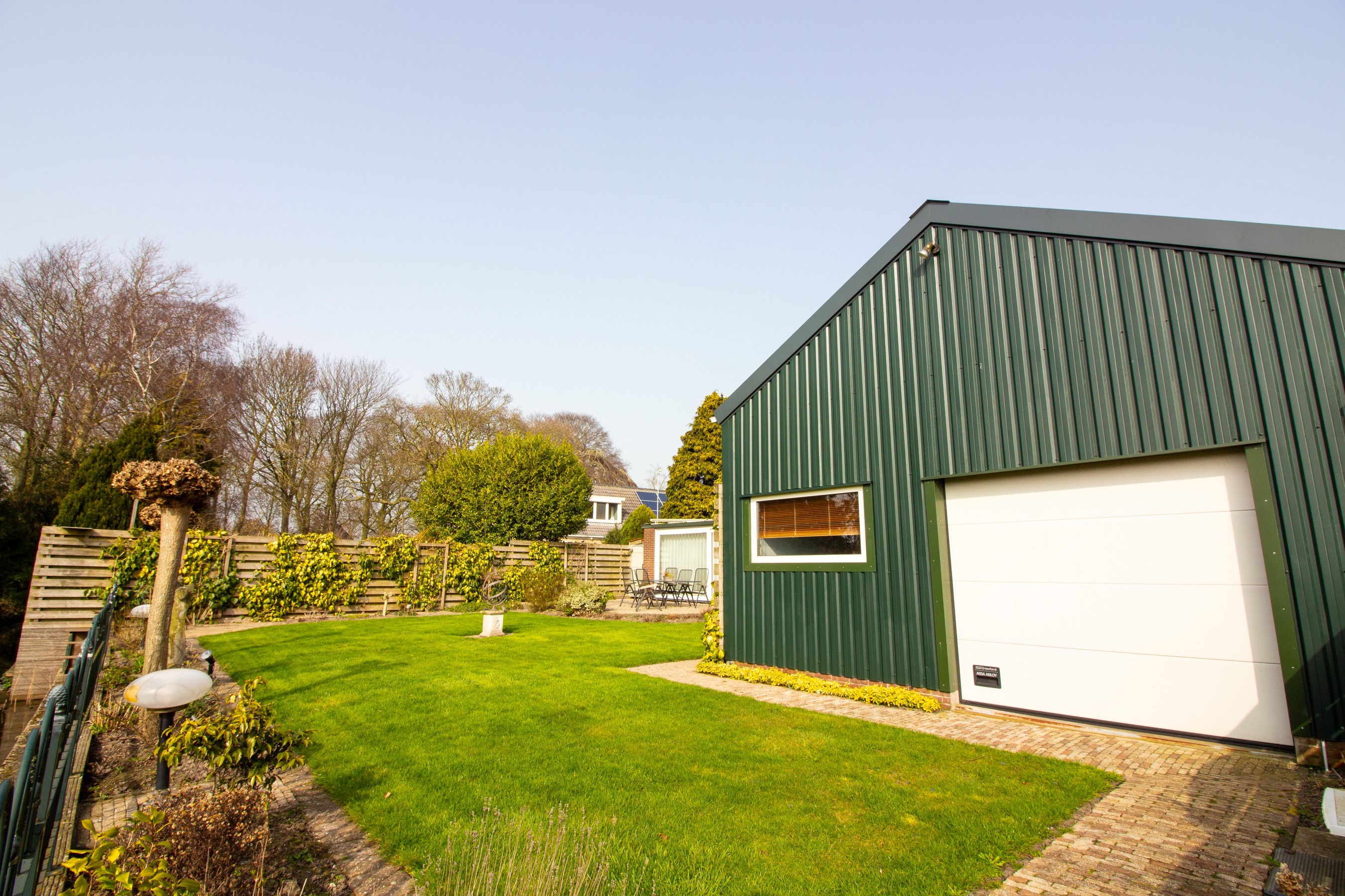 De garage is verder nog opgedeeld in een aparte werkplaats met een vaste trap naar de verdieping en aan het einde van de garage is een grote schuur aangebouwd. Via openslaande tussendeuren kunt u de aangebouwde schuur bereiken. Deze schuur is voorzien van betontegels, sectionaaldeur aan de achterzijde met toegang naar de tuin, een extra kantoorgedeelte dat eveneens verwarmd is.