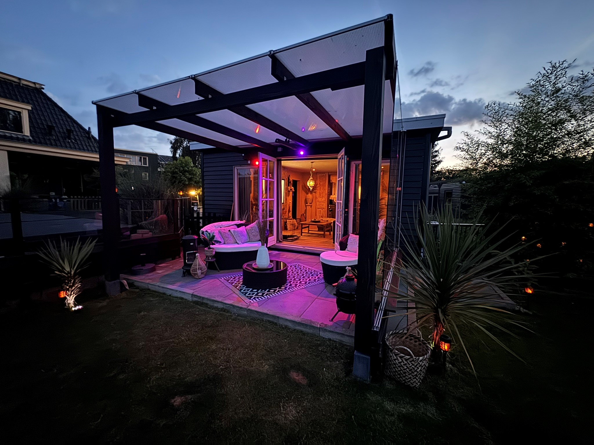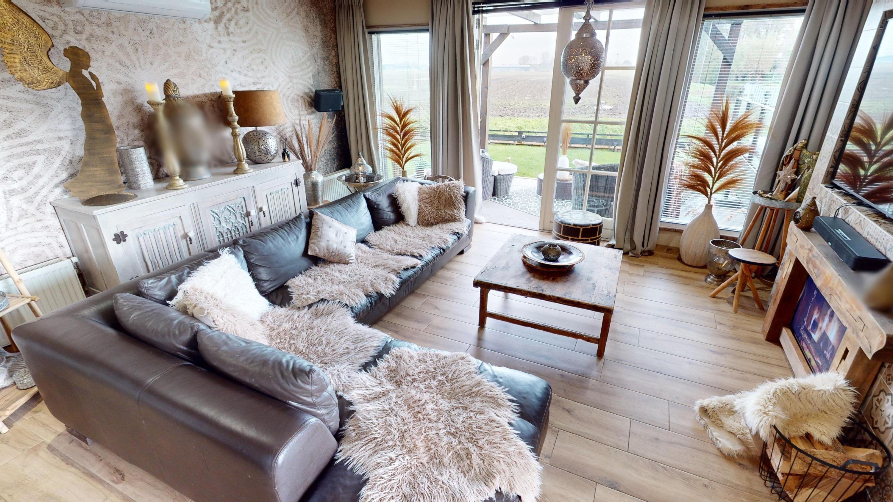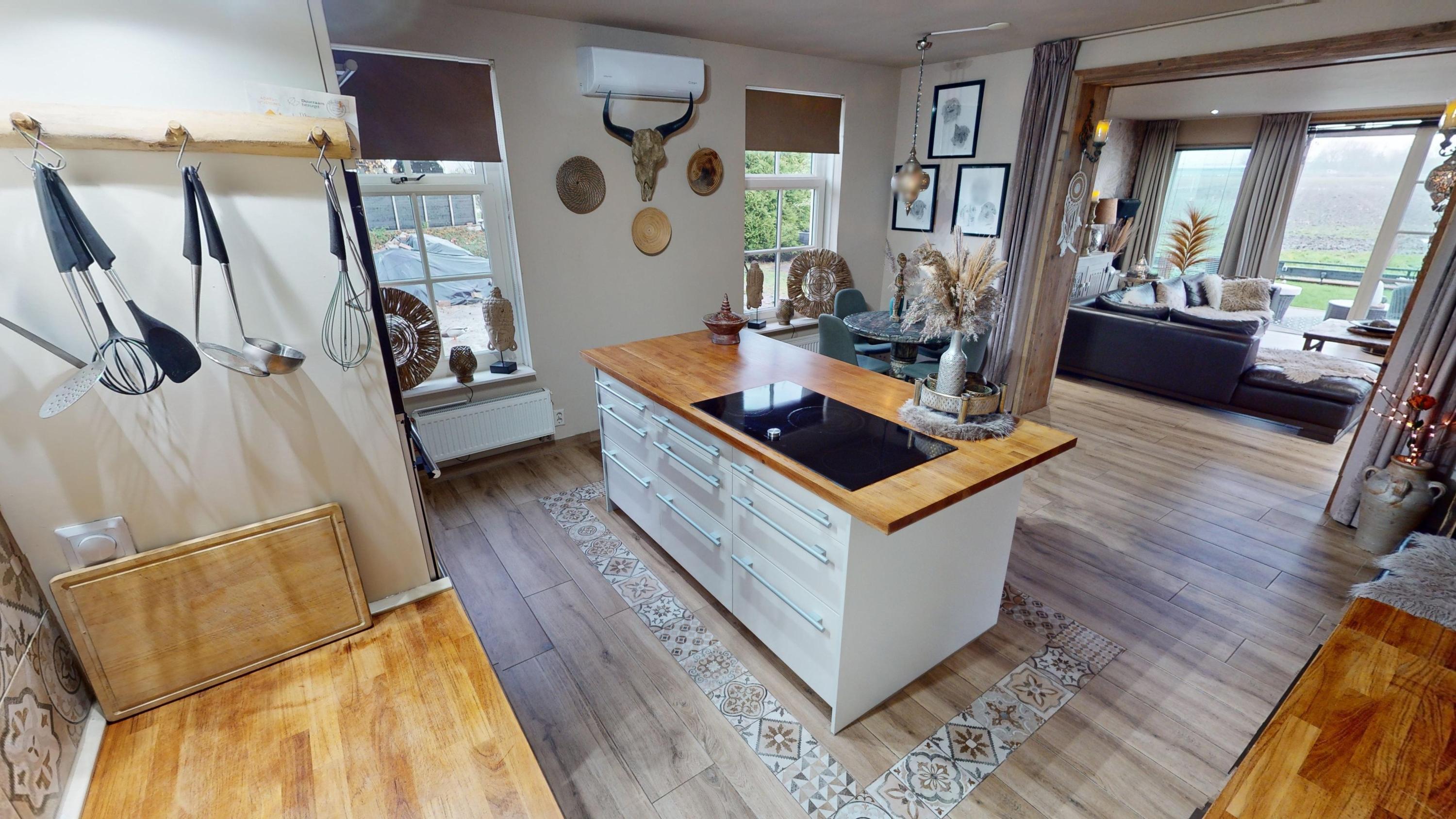 U heeft vanuit hier fraai zicht over de weilanden. Vanuit de serre heeft u ook toegang naar de overdekte veranda. Het geeft u een zeer gezellig (vakantie-) gevoel. U zult daarom ook veel gebruik maken van deze “buiten-woonkamer”. Zeker als u hier een fijne lounge-set plaatst! Via de veranda kunt u de achterliggende tuin bereiken.