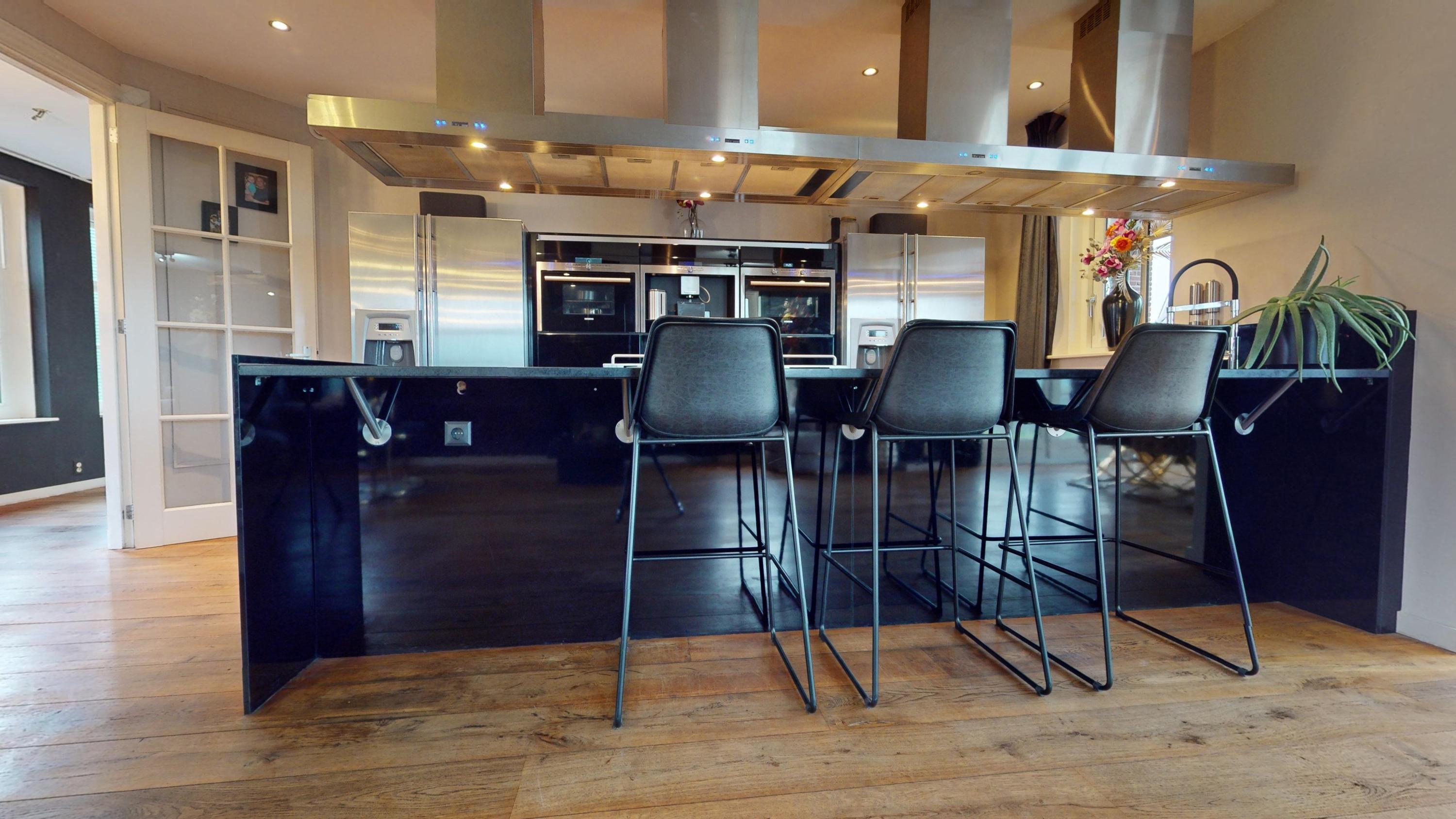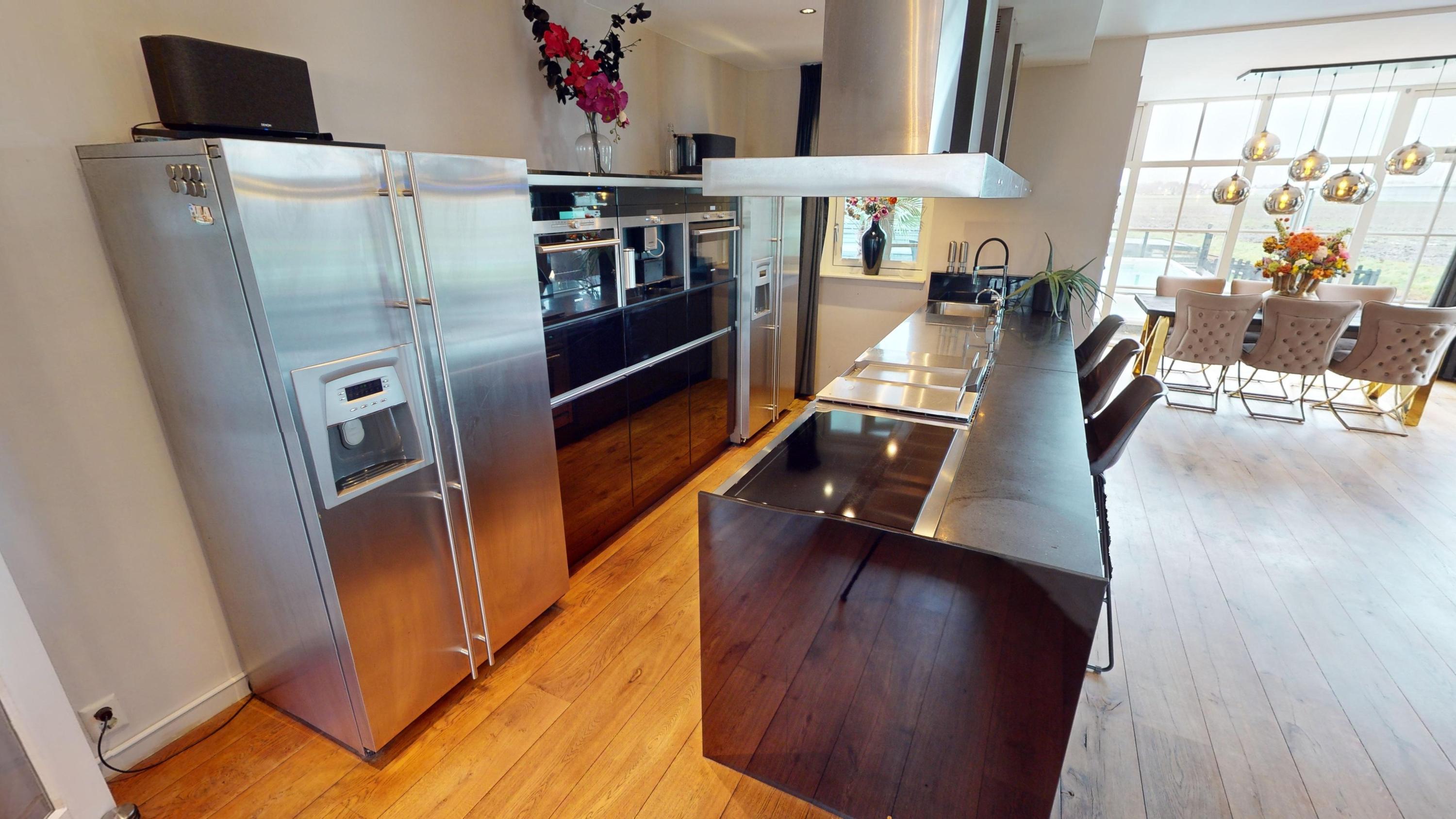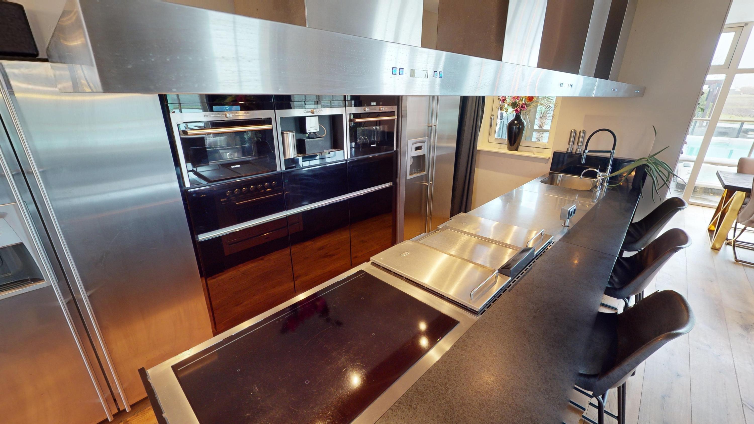 Keuken: de luxe moderne keuken is de centrale plaats in deze woning en voorzien van veel RVS accenten. U heeft van alle kanten vanuit deze bijzondere keuken fijn contact met uw huisgenoten of met vrienden/familie als u een heerlijke maaltijd voor ze kookt. Een heerlijke plek om samen met de kids de dag door te nemen onder het genot van een kopje thee of om samen met familie of vrienden een heerlijk dineravondje te organiseren. Als het volgende gerecht wordt voorbereid, hoeft de kok immers niets te missen van het gesprek aan tafel! Deze keuken is werkelijk van alle gemakken voorzien. De keuken is in een rechte opstelling geplaatst met een handige eetbar. Deze uitgebreide keuken is voorzien van 4 afzuigsystemen, inductiekookplaat, Boretti gas/ovencombinatie met wokbrander, een Amerikaanse koel/vriescombinatie, combimagnetron, koffiezetapparaat, stoomoven, cooker en een vaatwasser.