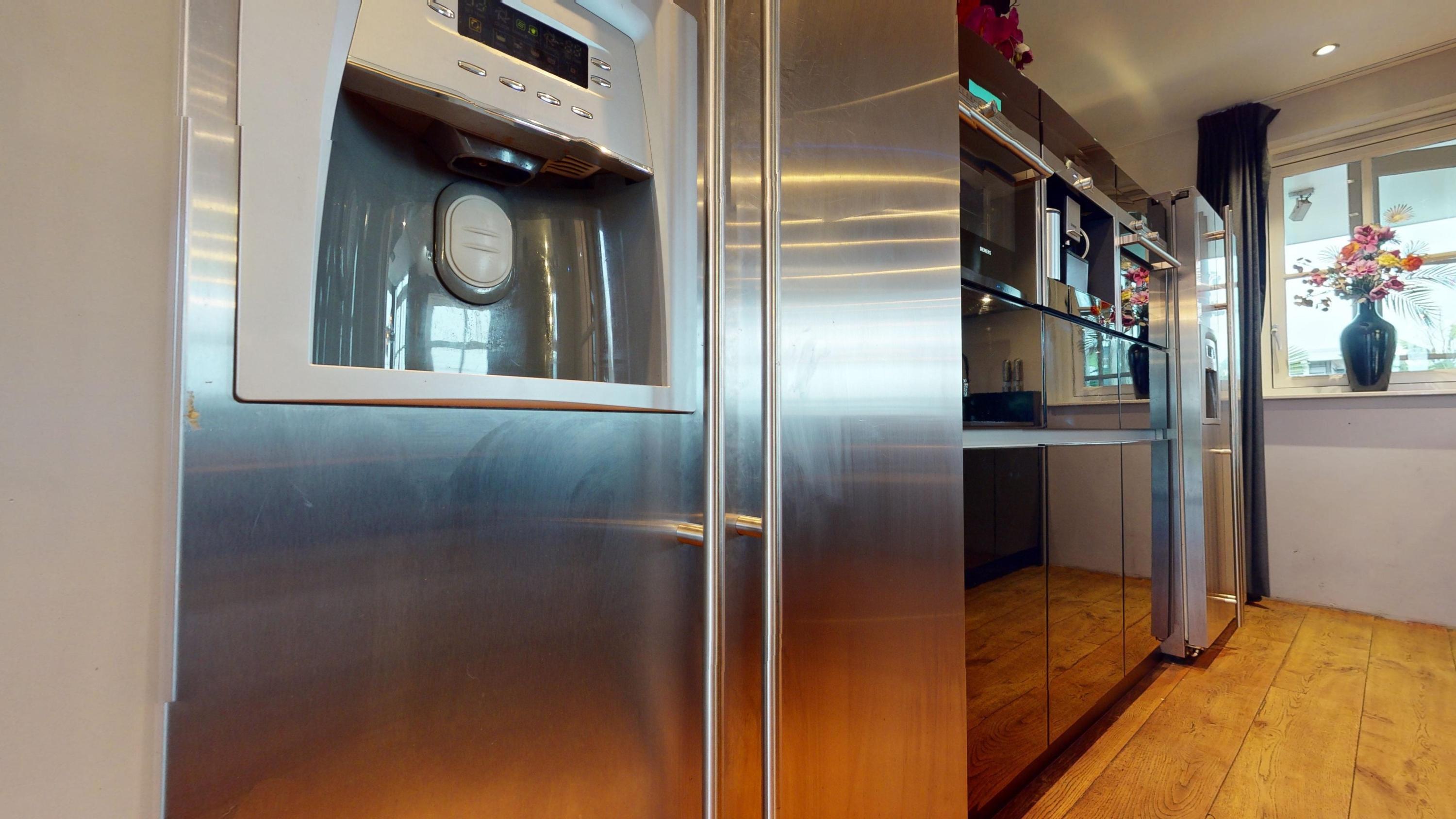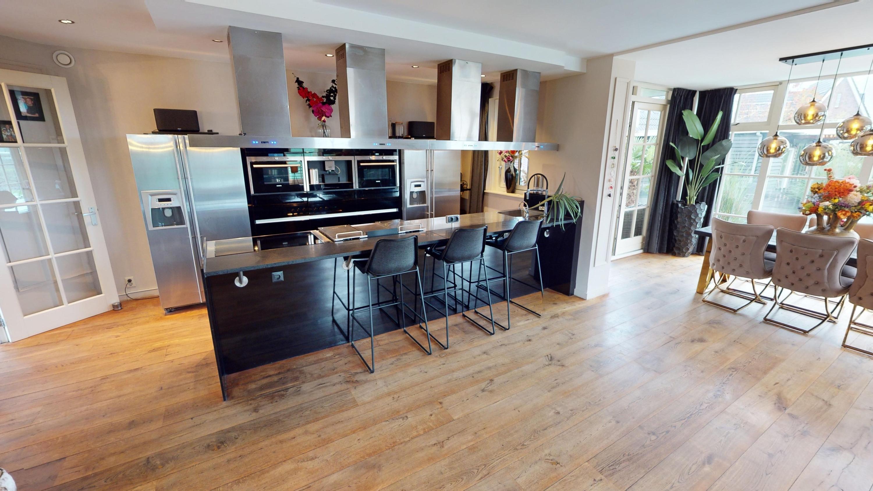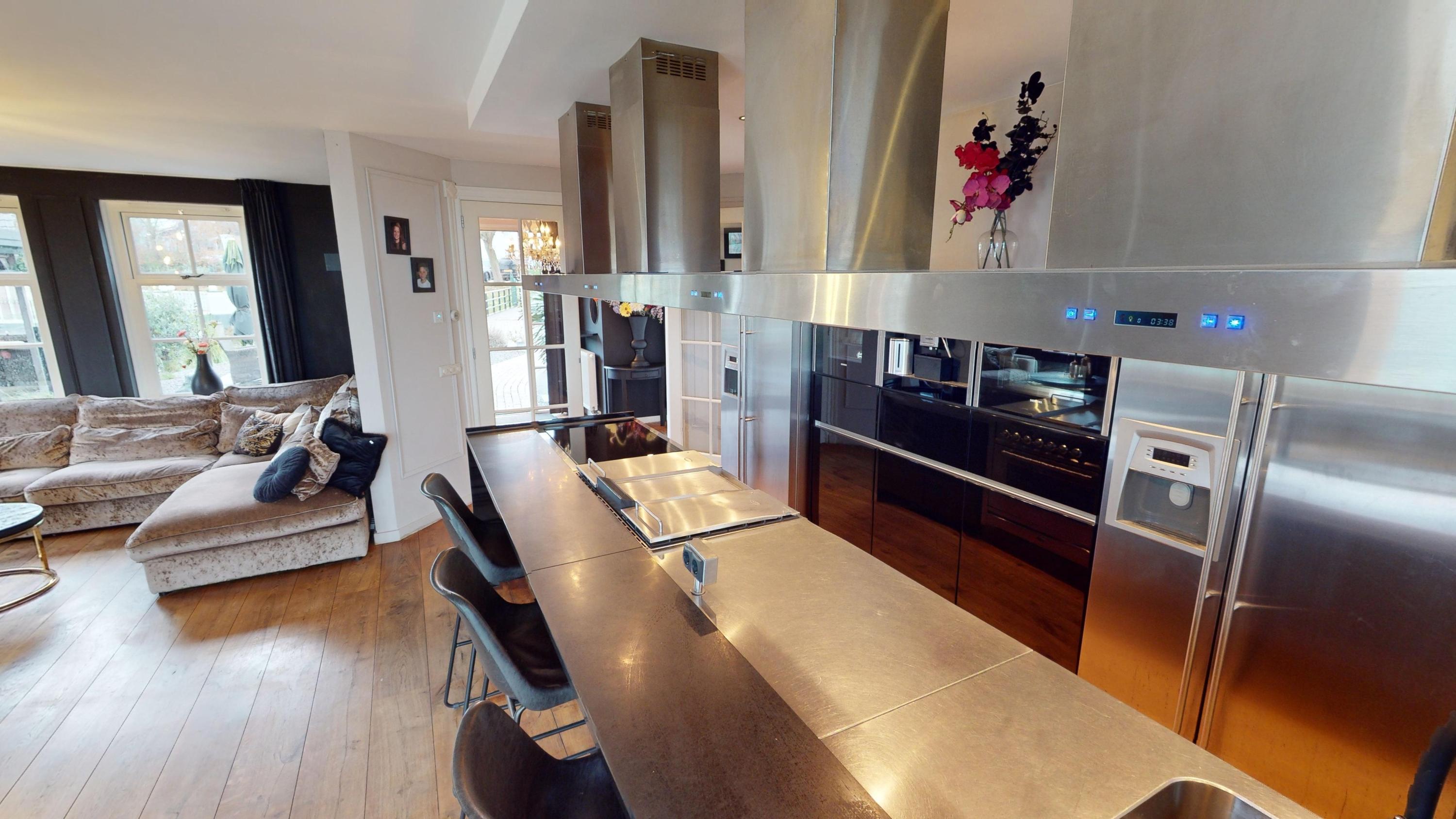 Keuken: de luxe moderne keuken is de centrale plaats in deze woning en voorzien van veel RVS accenten. U heeft van alle kanten vanuit deze bijzondere keuken fijn contact met uw huisgenoten of met vrienden/familie als u een heerlijke maaltijd voor ze kookt. Een heerlijke plek om samen met de kids de dag door te nemen onder het genot van een kopje thee of om samen met familie of vrienden een heerlijk dineravondje te organiseren. Als het volgende gerecht wordt voorbereid, hoeft de kok immers niets te missen van het gesprek aan tafel! Deze keuken is werkelijk van alle gemakken voorzien. De keuken is in een rechte opstelling geplaatst met een handige eetbar. Deze uitgebreide keuken is voorzien van 4 afzuigsystemen, inductiekookplaat, Boretti gas/ovencombinatie met wokbrander, een Amerikaanse koel/vriescombinatie, combimagnetron, koffiezetapparaat, stoomoven, cooker en een vaatwasser.