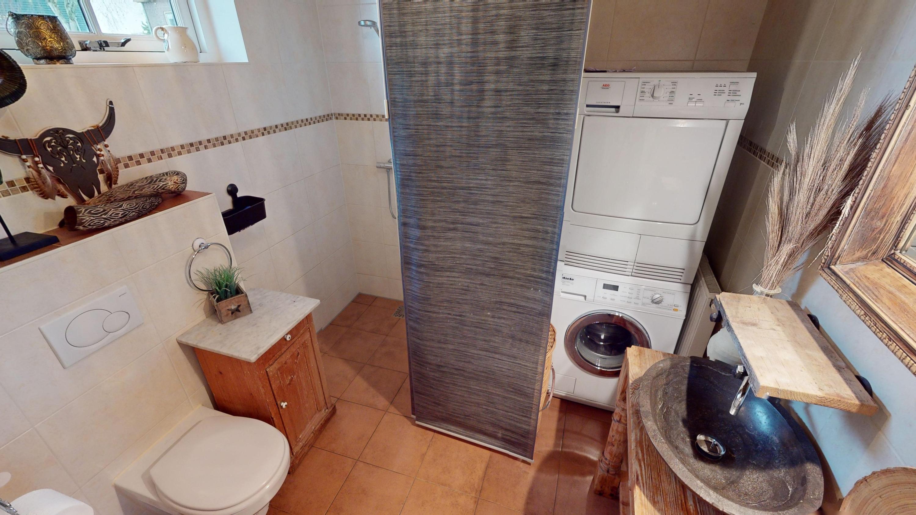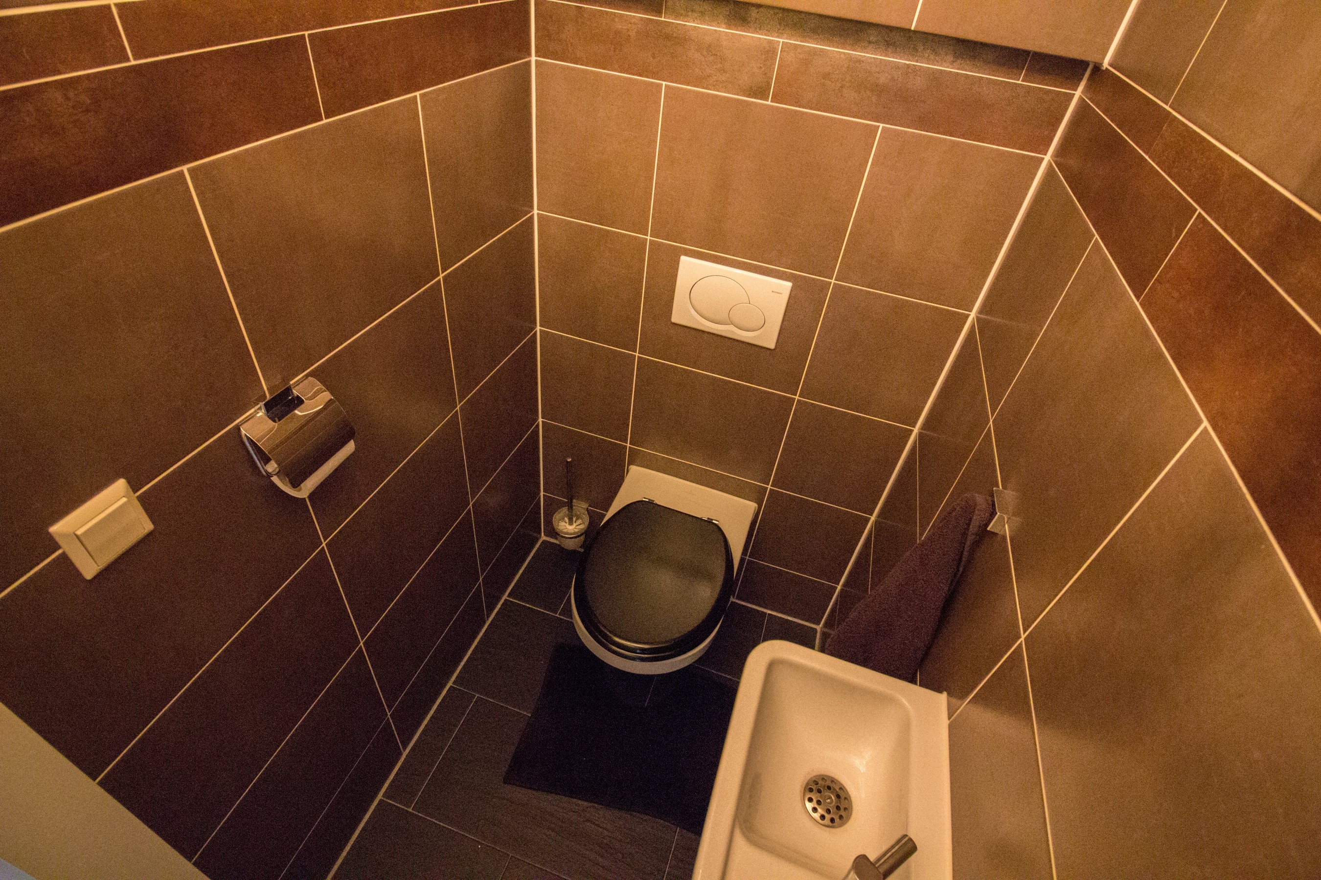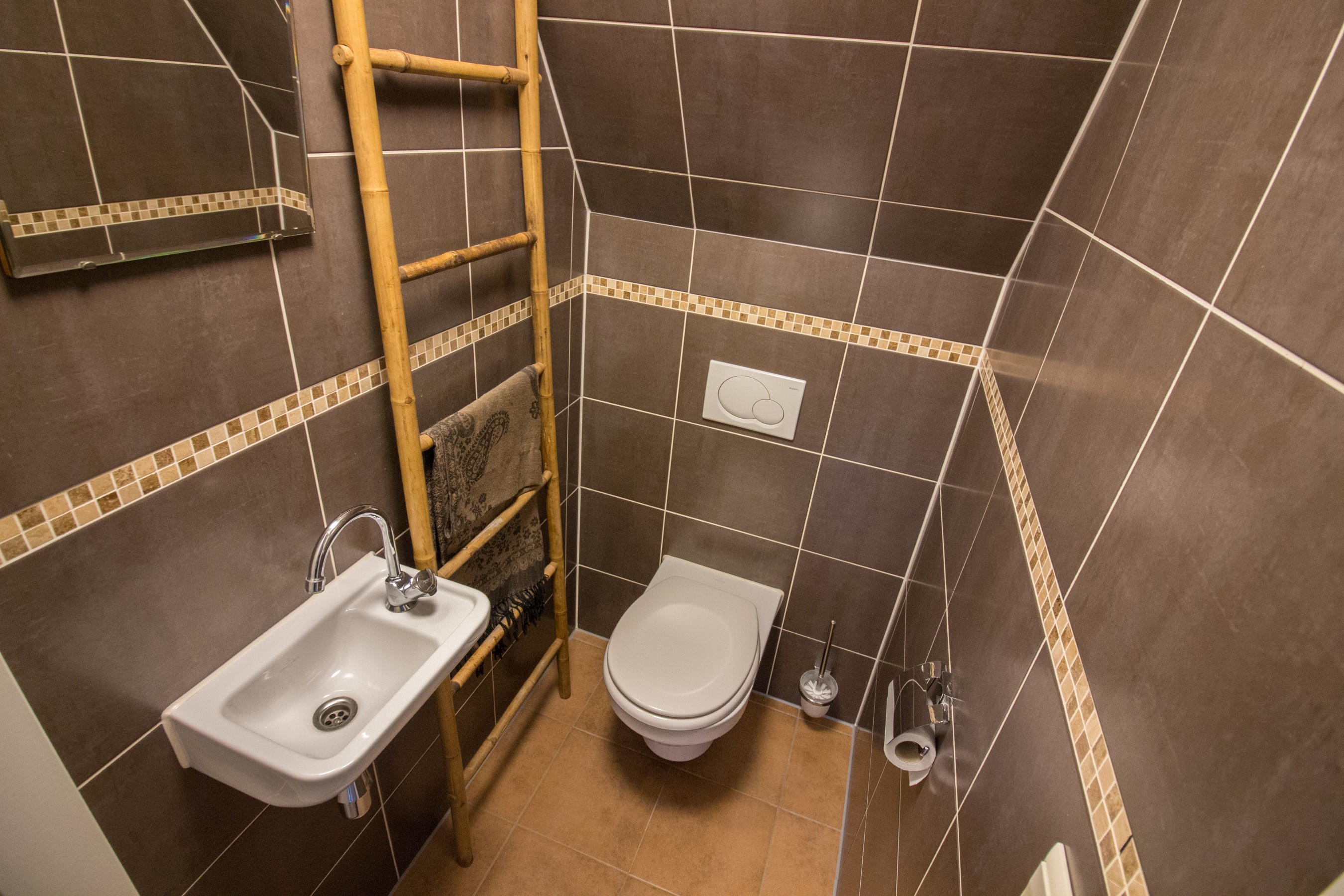 Entree hoofdgebouw: via de entree aan de voorzijde komt u in de ruime hal met garderoberuimte, toiletruimte en meterkast. Via deze hal kunt u de 1e verdieping bereiken en een slaapkamer/bijkeuken op de begane grond. De moderne toiletruimte is volledig betegeld en voorzien van een hangcloset en een fonteintje.