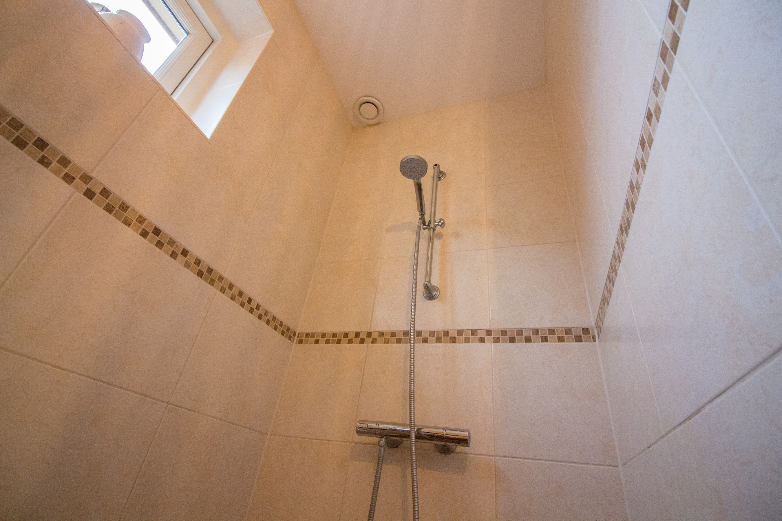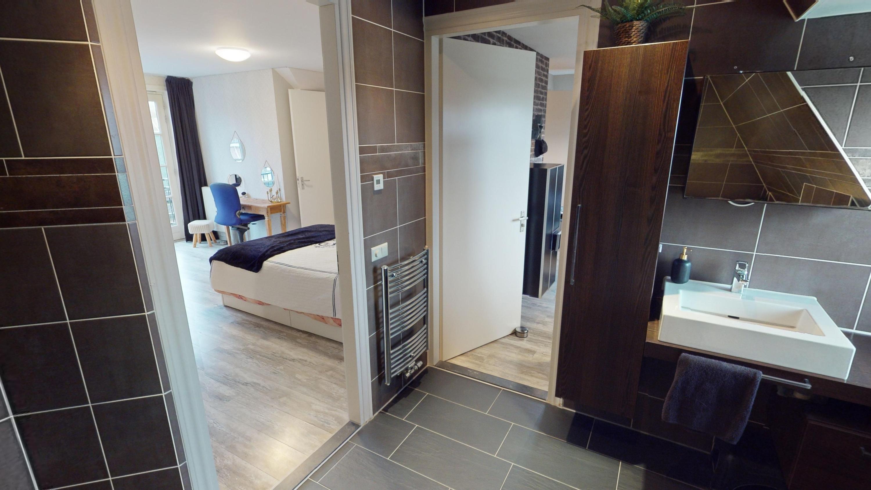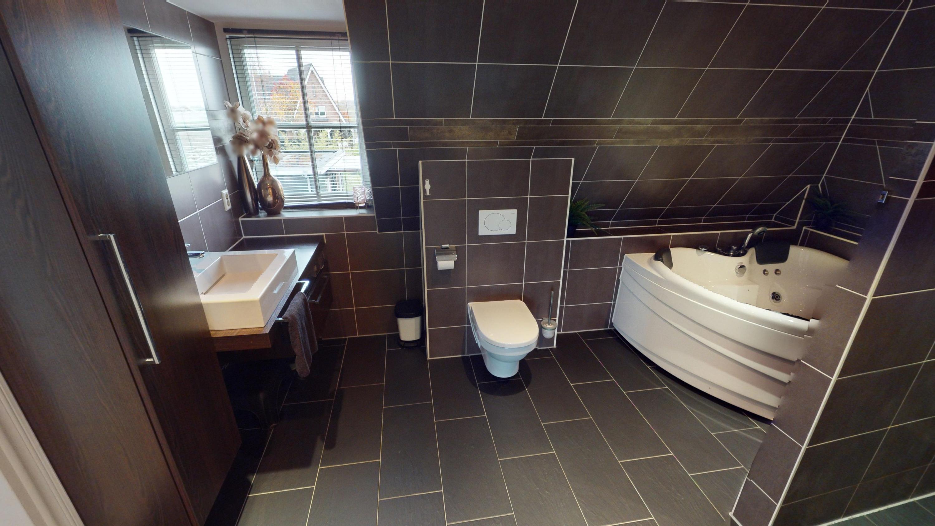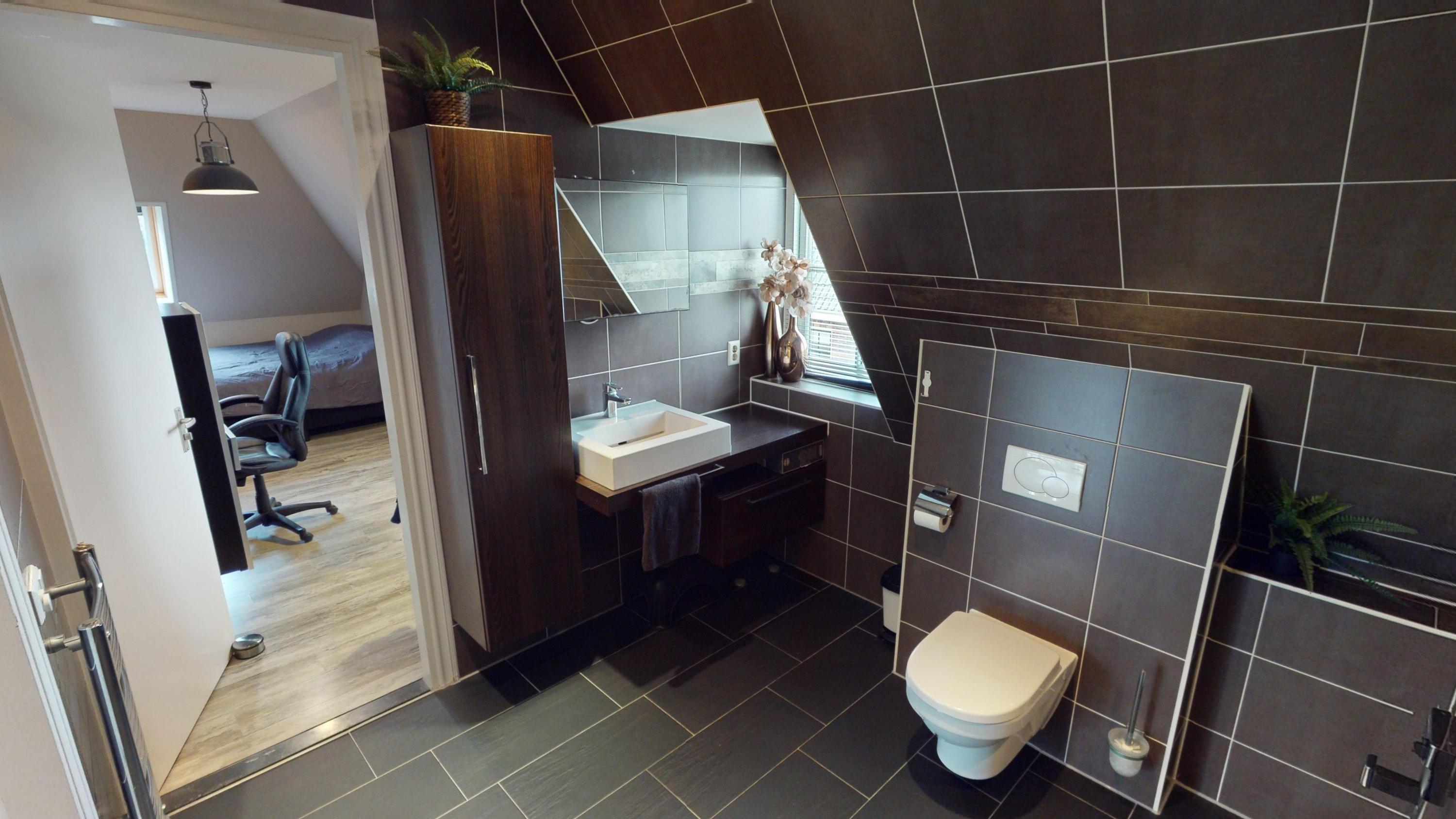 De zeer ruime en luxe badkamer is volledig betegeld en een ware relaxruimte, waar u na een drukke werkdag heerlijk kunt ontspannen. De badkamer is voorzien van een whirlpool ligbad, separate inloopdouche, hangcloset en een fraai wastafelmeubel.