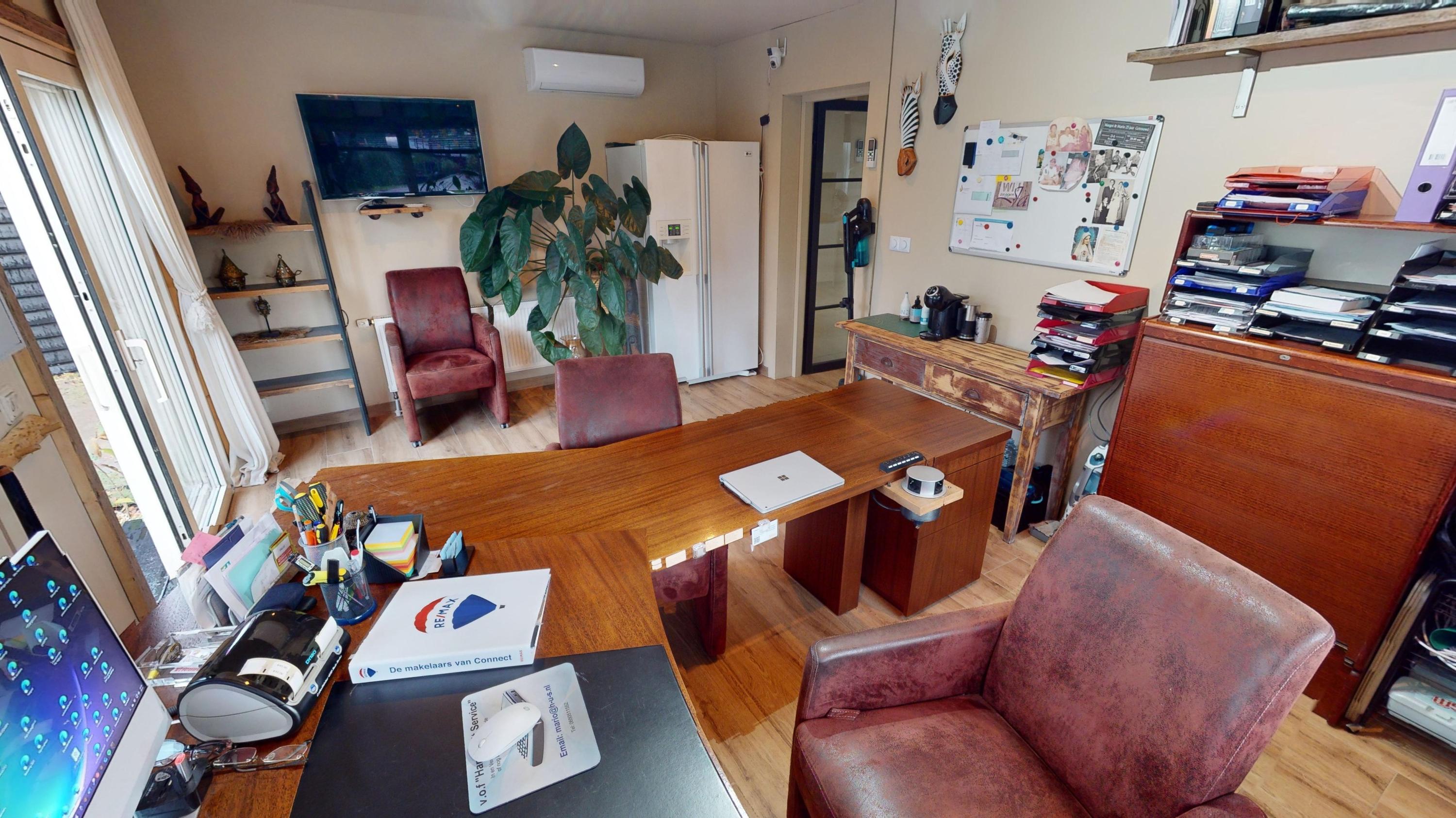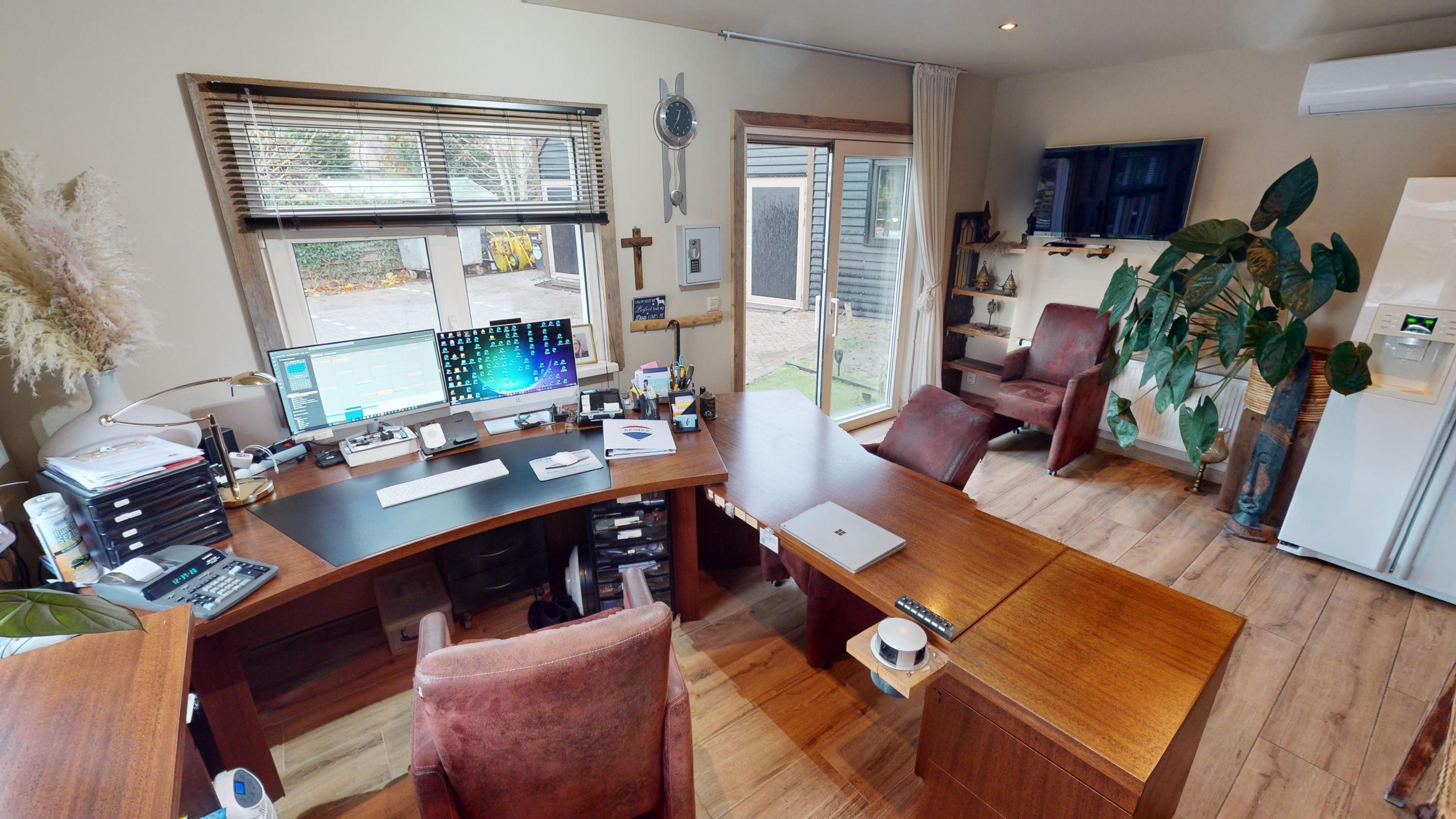 In het bijgebouw kunt prima een kantoor of praktijkruimte inrichten. Op de parterre is een ruime woonkamer en een open moderne keuken met inbouwapparatuur aanwezig. De moderne lichte keuken in L-vorm is extra voorzien van een kookeiland. Via de keuken kunt u het naastgelegen kantoor bereiken. Op de begane grond treft u eveneens een moderne badkamer met inloopdouche, hangcloset en een apart wastafelmeubel. In deze ruimte is tevens de mogelijkheid voor een wasmachine en drogeropstelling. De 1e verdieping is via een vaste trap te bereiken. Hier is een ruime slaapkamer aanwezig. Het bijgebouw is zeer smaakvol afgewerkt en met airco’s uitgevoerd.
