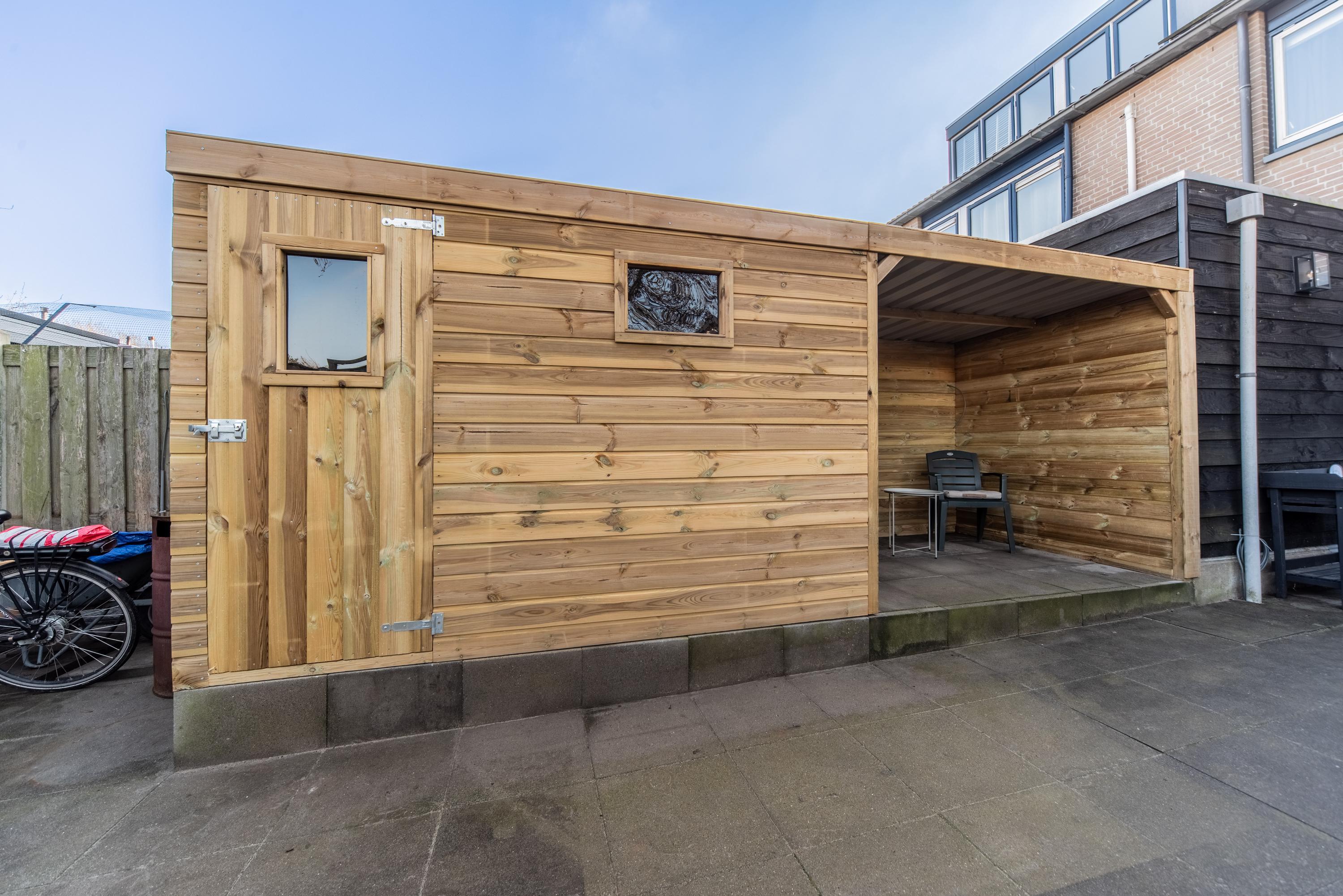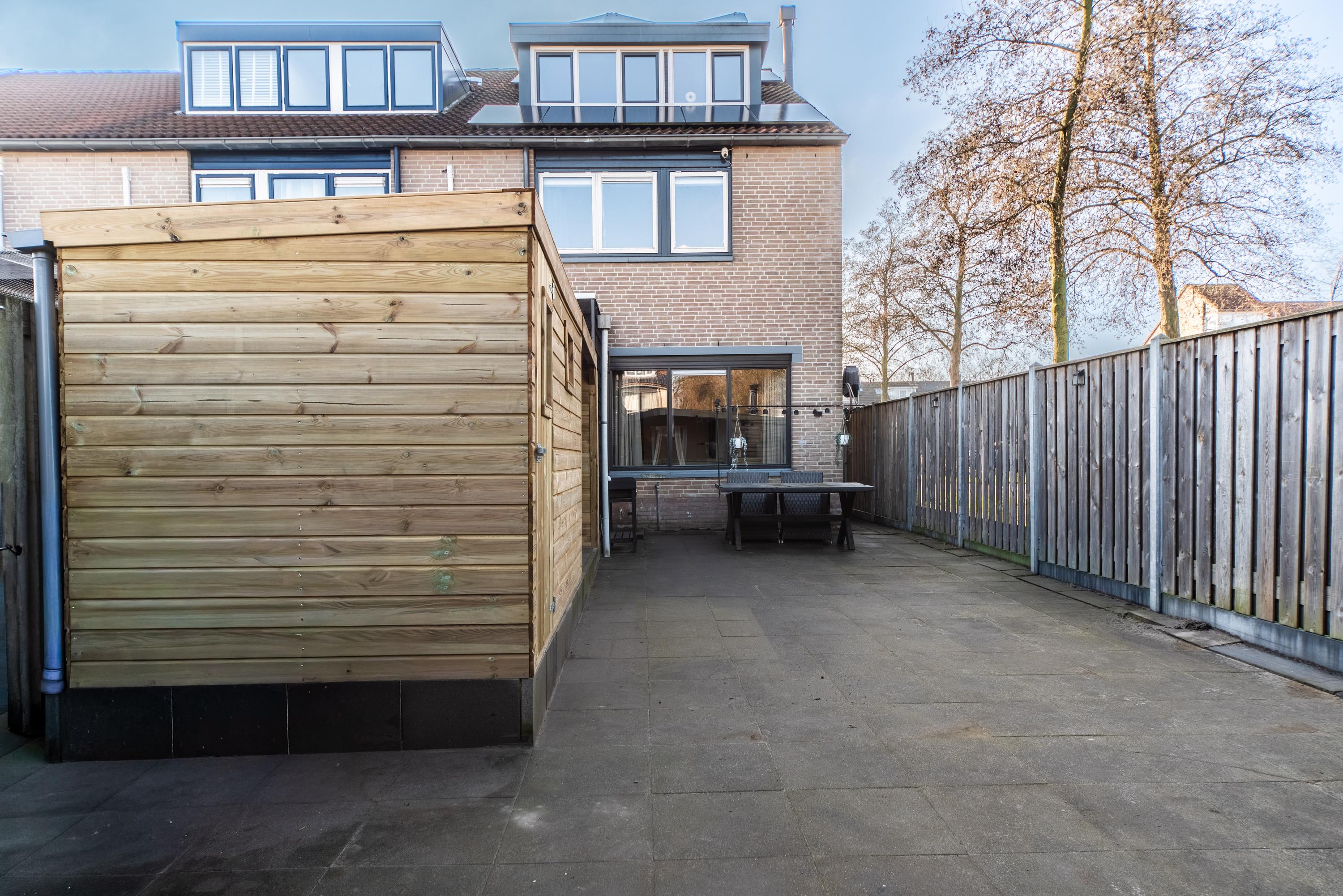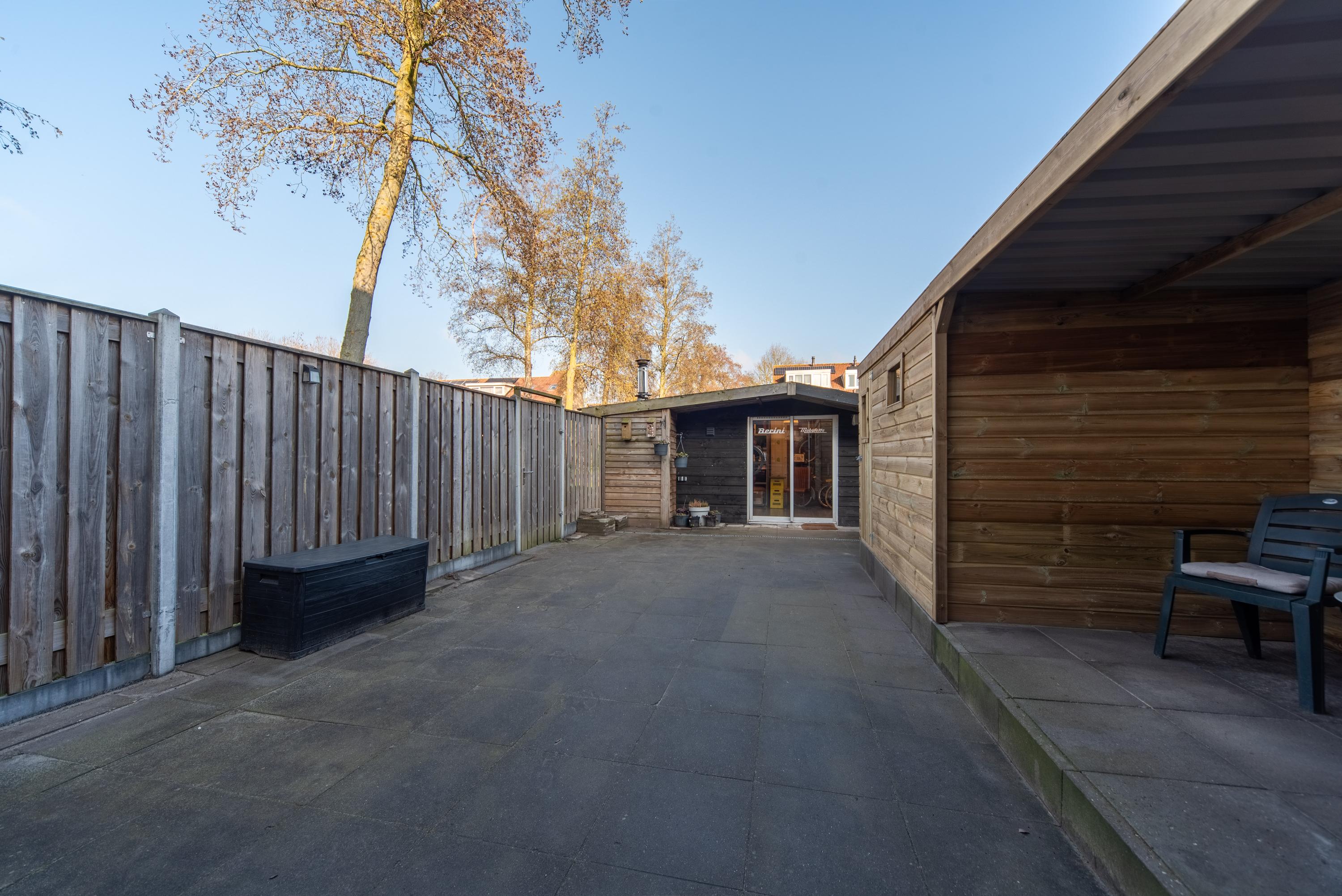 De volledig betegelde achtertuin, gelegen op het noordoosten, is verzorgd aangelegd en beschikt over een nagenoeg nieuwe overkapping met berging, een achterom en een tweede berging/hobby werkplaats, wat zorgt voor voldoende opslag- en gebruiksmogelijkheden.