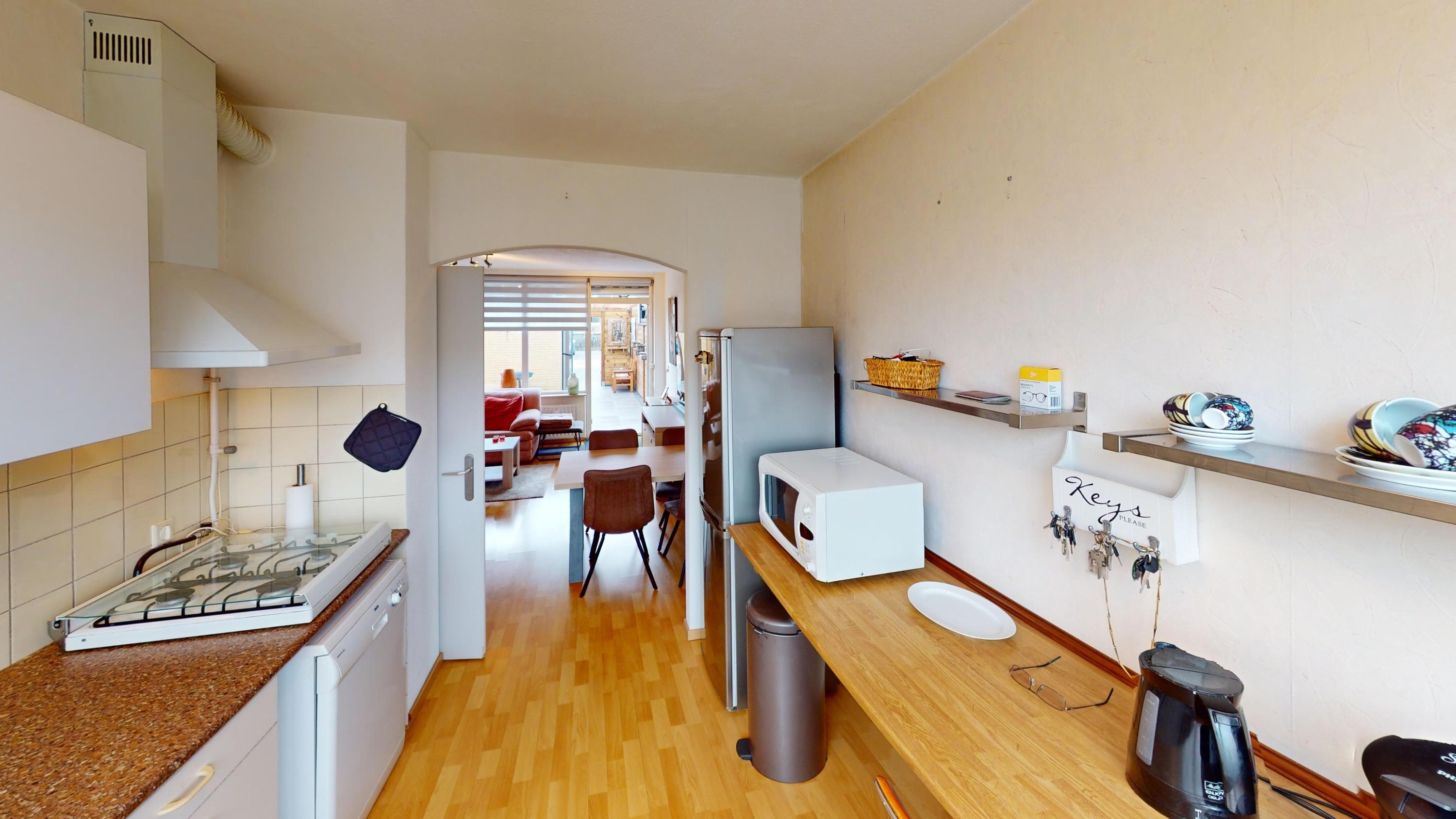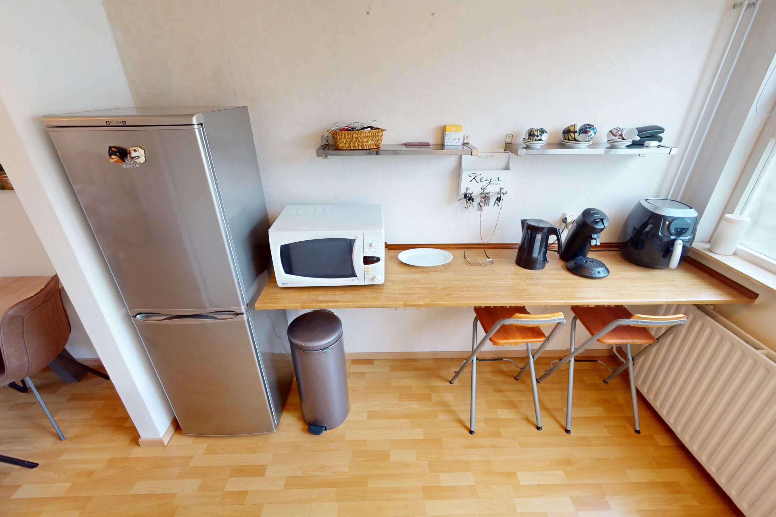 Middels een toog kunt u de functionele open keuken bereiken. Deze keuken is aan de voorzijde van de woning gelegen. Vanuit de keuken heeft u zicht op de straat en openbaar groen. De keuken is in rechte optelling geplaatst. Aan apparatuur heeft u een 4 pits gaskookplaat, vaatwasser en een afzuigkap tot uw beschiking. U heeft hier eenvoudig de mogelijkheid om een keuken in een L- of U-opstelling te plaatsen.